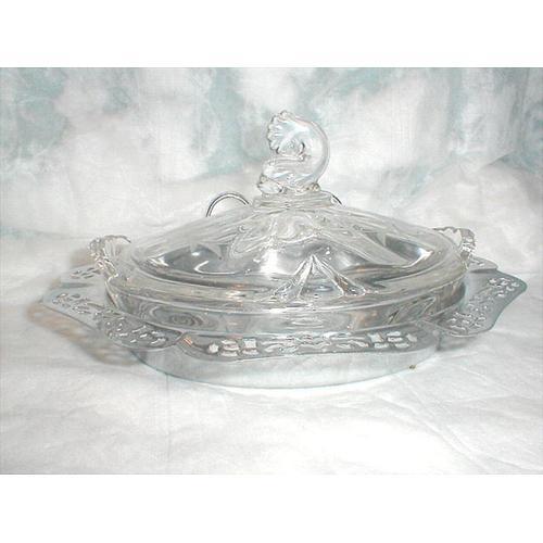 HERE IS A GREAT LEMON DISH WITH A DOLPHIN FINAL AND ETCHED LID THAT RESTS IN A FABER BROS. CHROME HOLDER. BOTH THE COVERED LEMON DISH AND HOLDER ARE IN WONDERFUL CONDIDITION AND MEASURES 5 IN. TALL WITH THE LID ON, 8 1/2 IN. IN LENGTH AND 6 1/2 IN. IN WIDTH.
