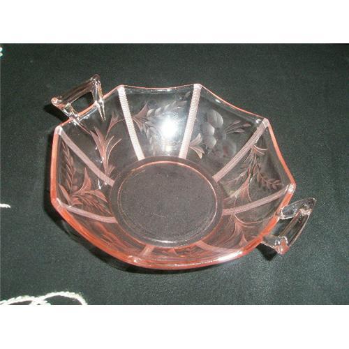 WE PRESENT TO YOU A MADE BY THE HEISEY GLASS CO. C. 1890, SHOWING A 8 SIDED DISH IN WATERMELON PINK, THIS RARE HARD TO FIND LITTLE JEWEL IS MITER & GRAVIC CUT ALL AROUND THE PERIMETER, WITH FLORAL PATTERNS, DIVIDED BY A SERIES OF VERY FINE CUTS SEPARATING EACH OF THE EIGHT SECTIONS. ALSO SHOWING APPLIED HANDLES ON EACH SIDE, AND IN EXTREMELY NICE CONDITION.