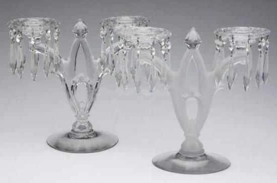 HEISEY NO. 402 / GOTHIC DOUBLE-SOCKET CANDELABRUMS, LOT OF TWO, Crystal/colorless, one example with satin finish to stem, No. 402 bobeche with factory polishing to inner ring and ~A~ prisms, makers mark on center point between arms. A. H. Heisey & Co. Second quarter 20th century. 11in H, 6 3/8in D base.