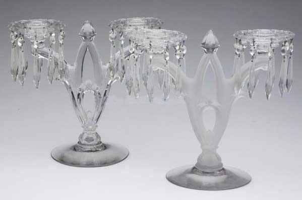 HEISEY NO. 402 / GOTHIC DOUBLE-SOCKET CANDELABRUMS, LOT OF TWO, Crystal/colorless, one example with satin finish to stem, No. 402 bobeche with factory polishing to inner ring and "A" prisms, makers mark on center point between arms. A. H. Heisey & Co