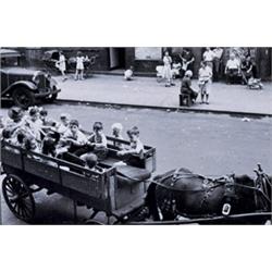 HELEN LEVITT (American, b. 1918) UNTITLED (NEW YORK) signed "Helen Levitt" in pencil on verso vintage gelatin silver contact print 2 3/8 x 3 5/8 in. (6 x 9.2 cm) 1930s PROVENANCE From the artist to the G. Gibson Gallery, SEATTLE Private Collection, WASHINGTON In this affectionate view of the New York City streets, we enter Levitt's world "where children play, where mothers tend their children, where old people gossip and observe. No one seems to work there, and, although there is deprivation, no one suffers from it. Anger, sorrow, and tension exist but only as moments in a grand and harmonious continuum. (No one is privileged or even middle class.)" (Phillips, HELEN LEVITT, San Francisco, 1991, p. 19). Levitt's preferred subject matter is children at play. She always remains at a discrete distance, which, in this case, seems to be from an elevated apartment window, and she uses a right angle viewfinder on her small, 35mm Leica. Levitt's images are too self-contained to make any social commentary. Because of this modest, lyric examination of life on the streets, the images are universally understood and appreciated. Levitt finds beauty in the poorer neighborhoods, since their residents spend more of their time outside, active on the city streets. In THE BULLETIN OF THE MUSEUM OF MODERN ART, Nancy Newhall writes about Levitt's first exhibition there: HELEN LEVITT: PHOTOGRAPHS OF CHILDREN (1943). "Helen Levitt seems to walk invisible among the children. She is young, she has the eye of a poet, and she has not forgotten the strange world which tunnels back through thousands of years to the dim beginnings of the human race." Here, in the foreground, a large group of children sit together in a driverless carriage, while adults observe from afar and children are seen scattered on the sidewalks, peeking in carriages and drawing with chalk. The size of the photograph forces the viewer to become physically intimate with this tender subject.