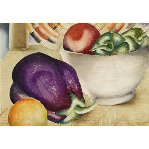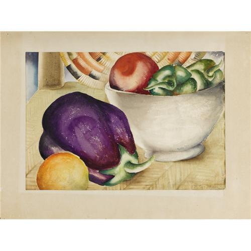 <B>HELEN SPELLMAN (1915-2002)</B></I><BR><I>Still Life with Eggplant,</B></I> 1930s<BR>Watercolor<BR>10in. x 14in.<BR>Signed lower right<BR><BR>Helen Marie Spellman was the younger sister of Coreen Mary Spellman. In the 1930s, she was the Director of Art Education at South Park High School in Beaumont, Texas. She received her Masters of Fine Arts from Texas Woman's University in 1933.<BR><BR>Provenance:<BR>Estate of Mick Spellman<BR>Acquired from the above by the present owner<BR><BR> <B>Condition Report:</B> Excellent condition. Unframed.<BR><BR><b>Shipping:</b> Requires 3rd Party Shipping (<a target="_blank" href="http://www.heritageauctions.com/common/shipping.php">view shipping information</a>)