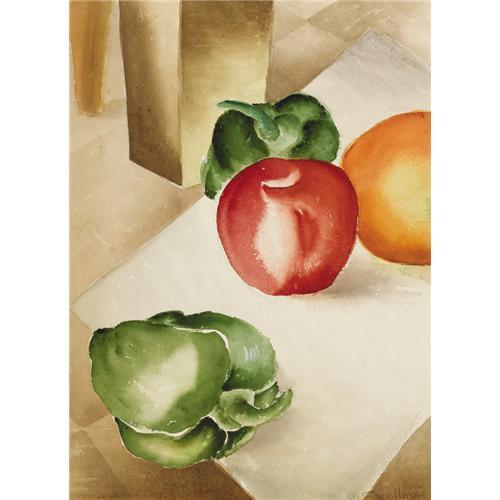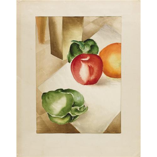 <B>HELEN SPELLMAN (1915-2002)</B></I><BR>Untitled Still Life with Peppers and Apple, 1930s<BR>Watercolor<BR>13in. x 9 3/4in.<BR>Signed lower right<BR><BR>A fine Regionalist still life from this rare early Texas woman artist.<BR><BR>Provenance:<BR>Estate of Mick Spellman<BR>Acquired from the above by the present owner<BR><BR> <B>Condition Report:</B> Excellent condition. Unframed.<BR><BR><b>Shipping:</b> Requires 3rd Party Shipping (<a target="_blank" href="http://www.heritageauctions.com/common/shipping.php">view shipping information</a>)