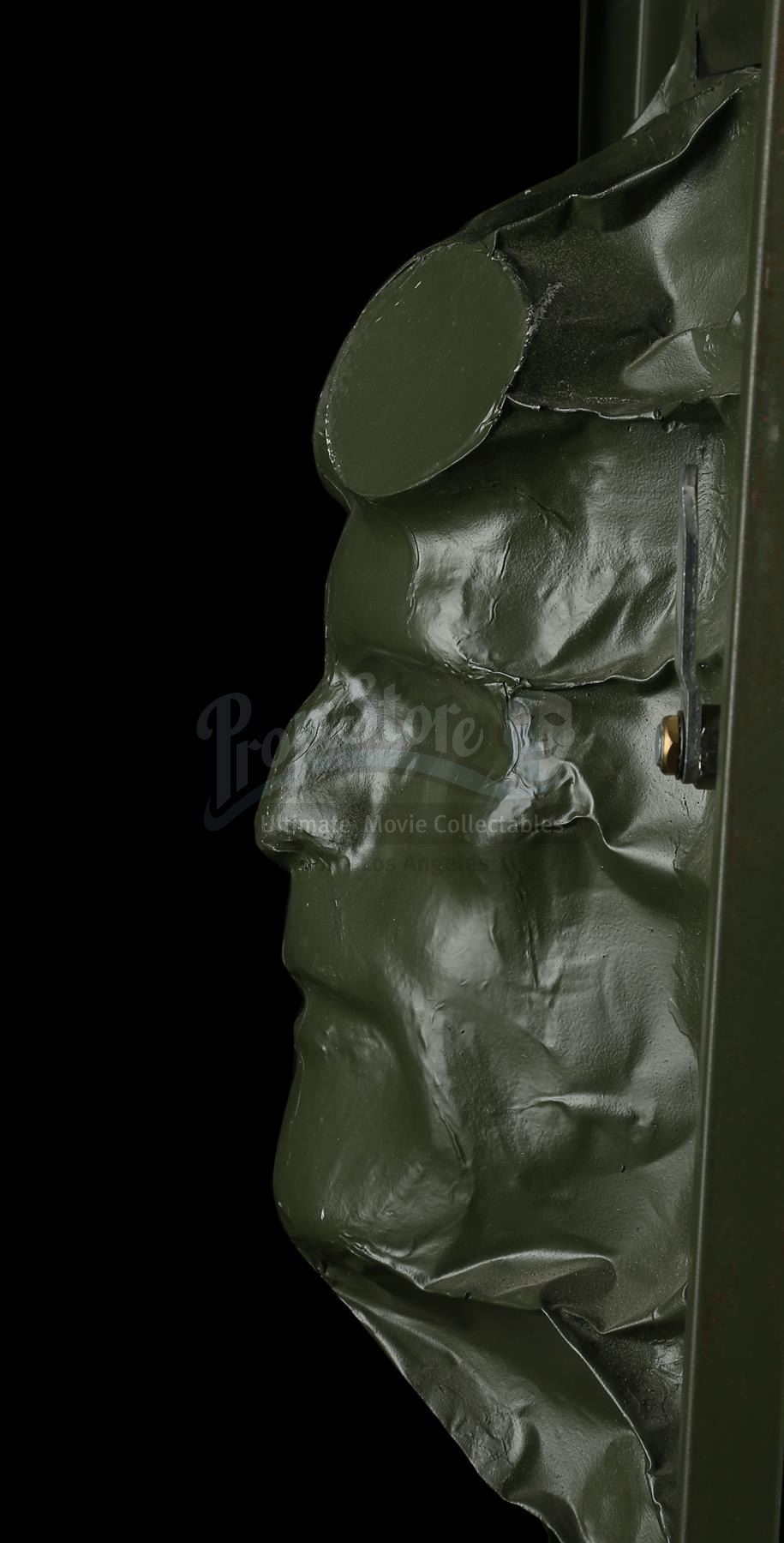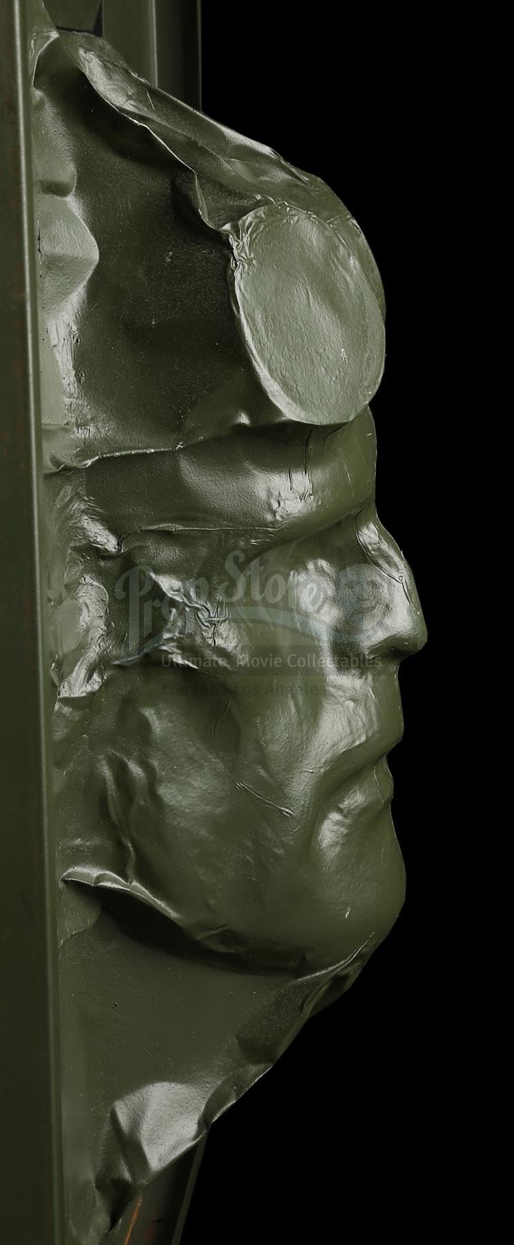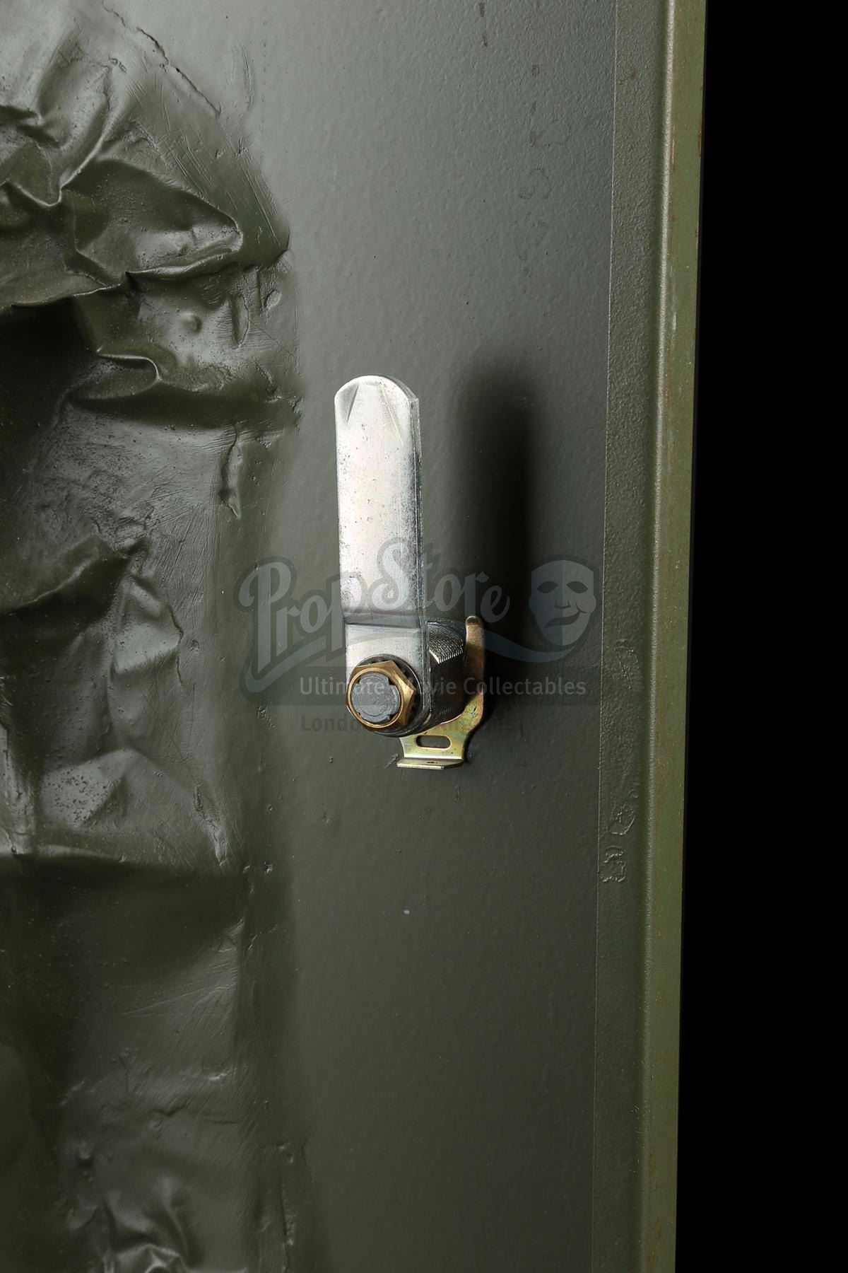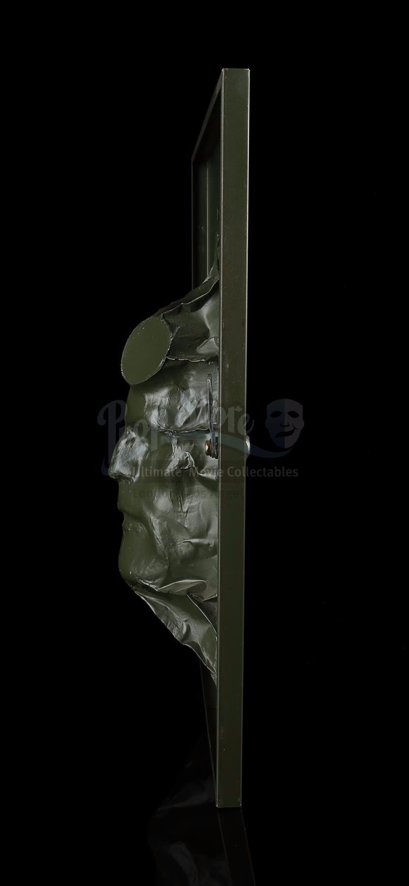 The door is made of folded metal with a fibreglass insert for Hellboy's face, carefully applied to give it the seamless appearance of twisted metal. The piece is finished in dark green paint with a label bearing the door number 236 inside the face print. A lock is present on the door's left-hand side. The door has some minor chips to the fibreglass and some surface wear to the paint finish from use. Dimensions: 15 cm x 45.5 cm x 55 cm (6'' x 18'' x 22'')