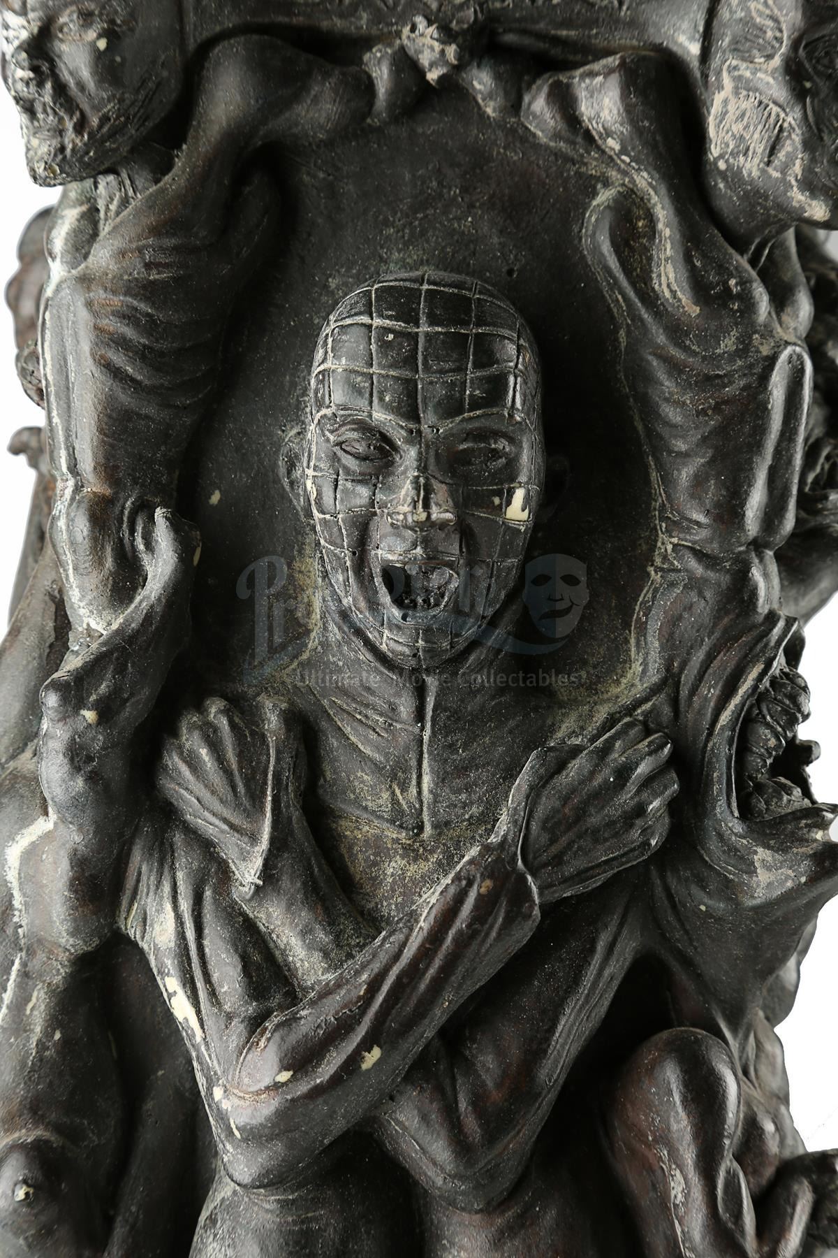 Made of resin, the maquette's design features the Cenobite Pinhead, the anguished faces of his victims and the Lament Configuration puzzle box. Finished in black paint, the maquette displays moderate wear to the paint finish, with some flaking exposing the off-white resin beneath. Dimensions: 17 cm x 13 cm x 41 cm (6 3/4'' x 5'' x 16 1/4'')