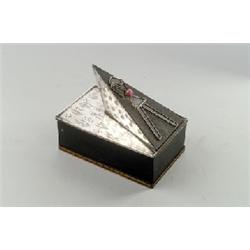 Silber, Holz. Rechteckige Form mit punziertem Muster im scharnierten Silberdeckel. Darauf eine überdimensional große keilförmige Handhabe mit Dekor einer Ballspielerin, ein roséfarbener Stein als Ball. 11 x 7 cm. Bez.: Meistermarke, Feingehaltsmarke 925 STERLING, Halbmond / Krone. 1950er Jahre