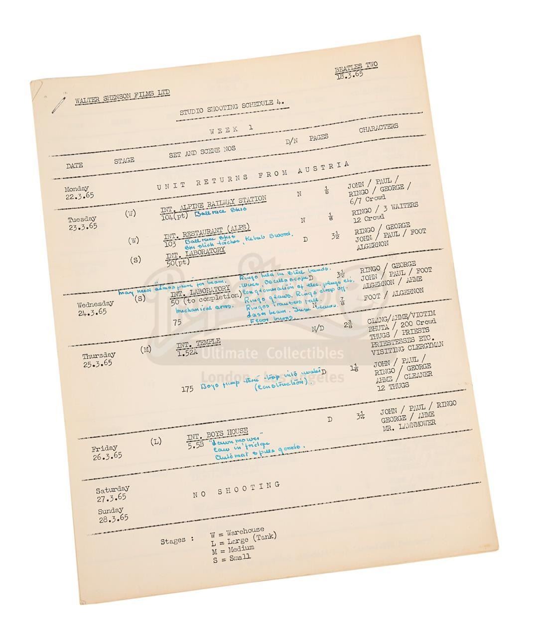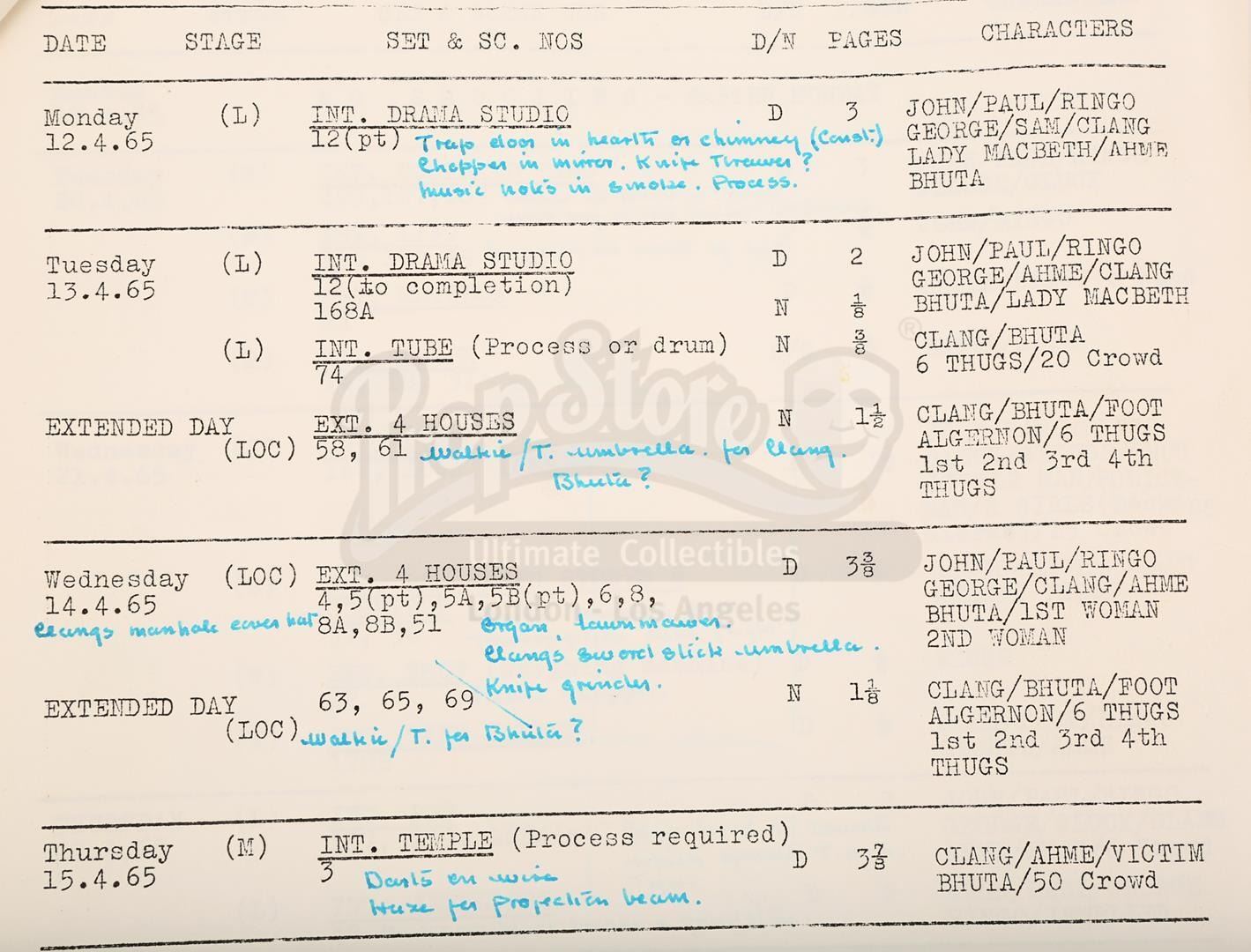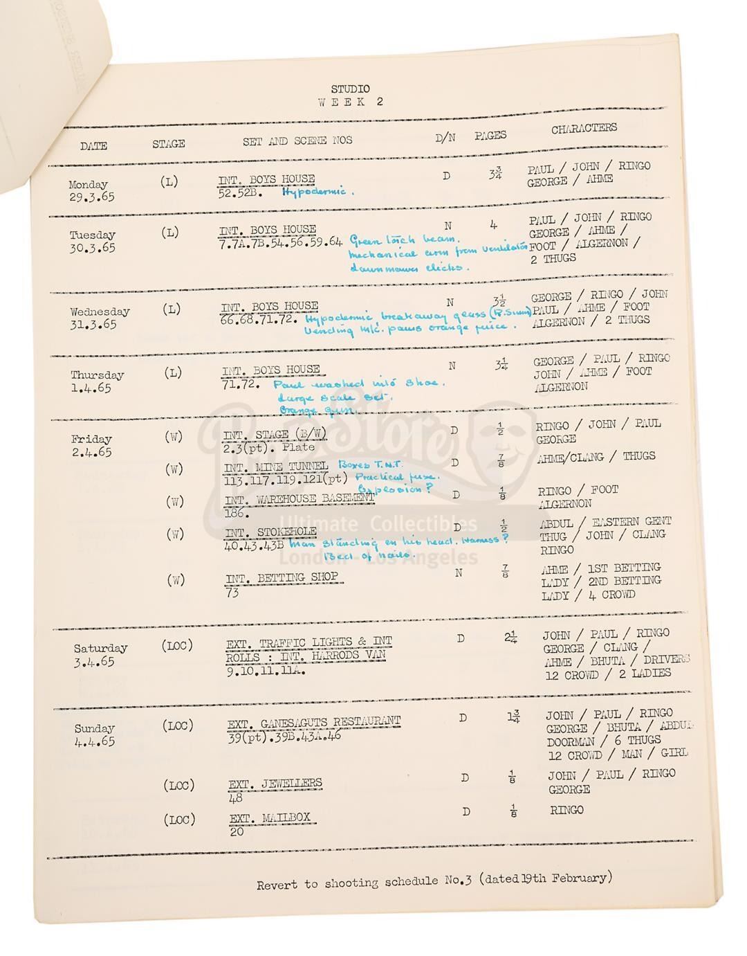 A script and shooting schedule from the production of The Beatles' second feature film Help!, directed by Richard Lester.