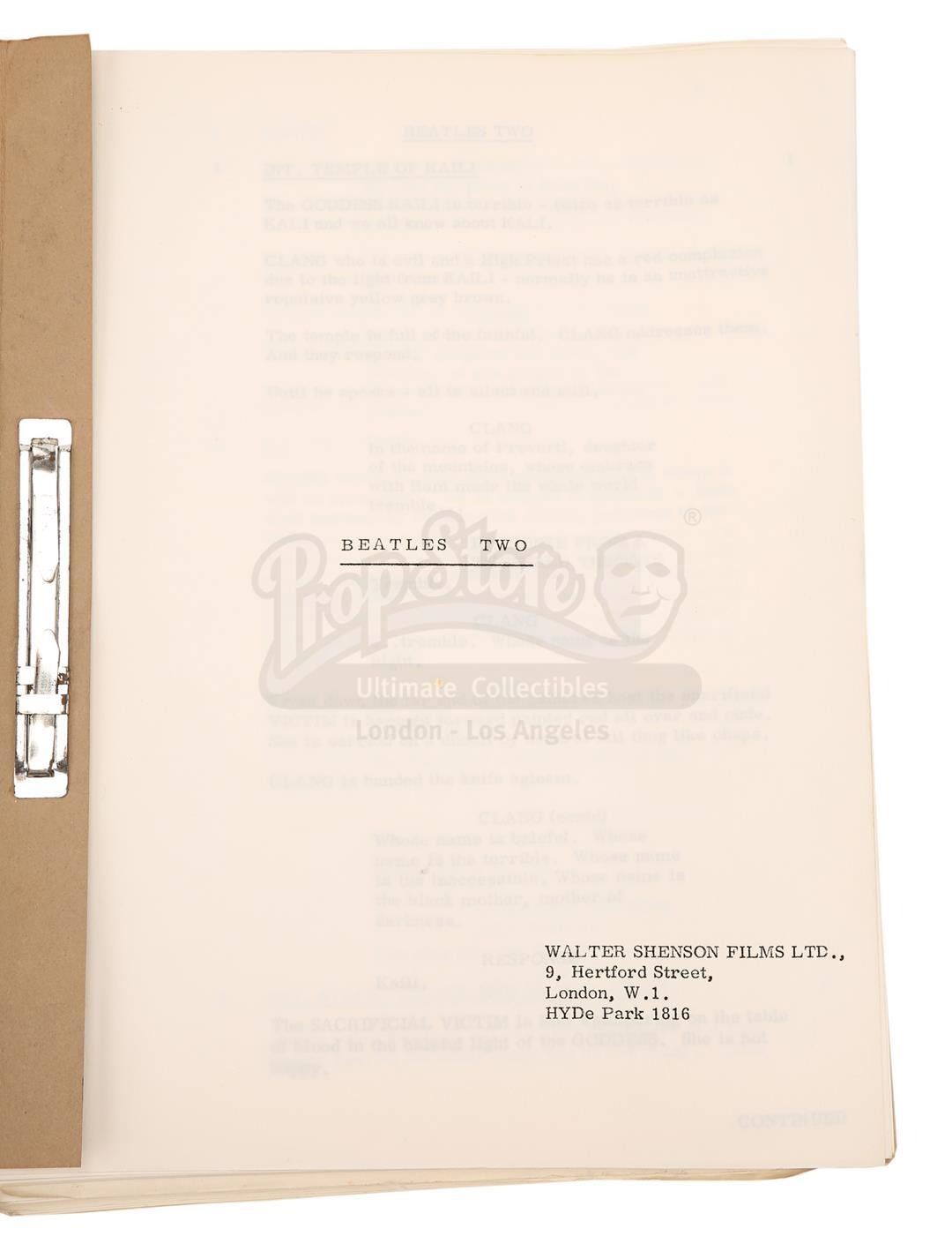 This production-used script belonged to special effects artist Cliff Richardson. It is 122 pages long, printed on US Letter paper, and bound in a brown card cover with a metal fastener. The title page bears the film's working title "Beatles Two" and the cover features Richardson's handwritten name.