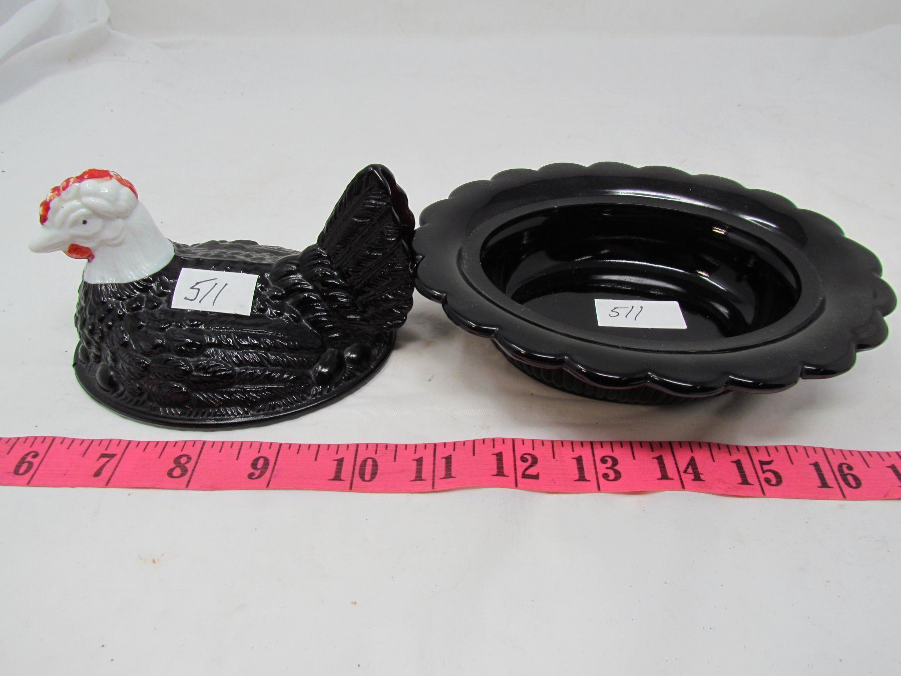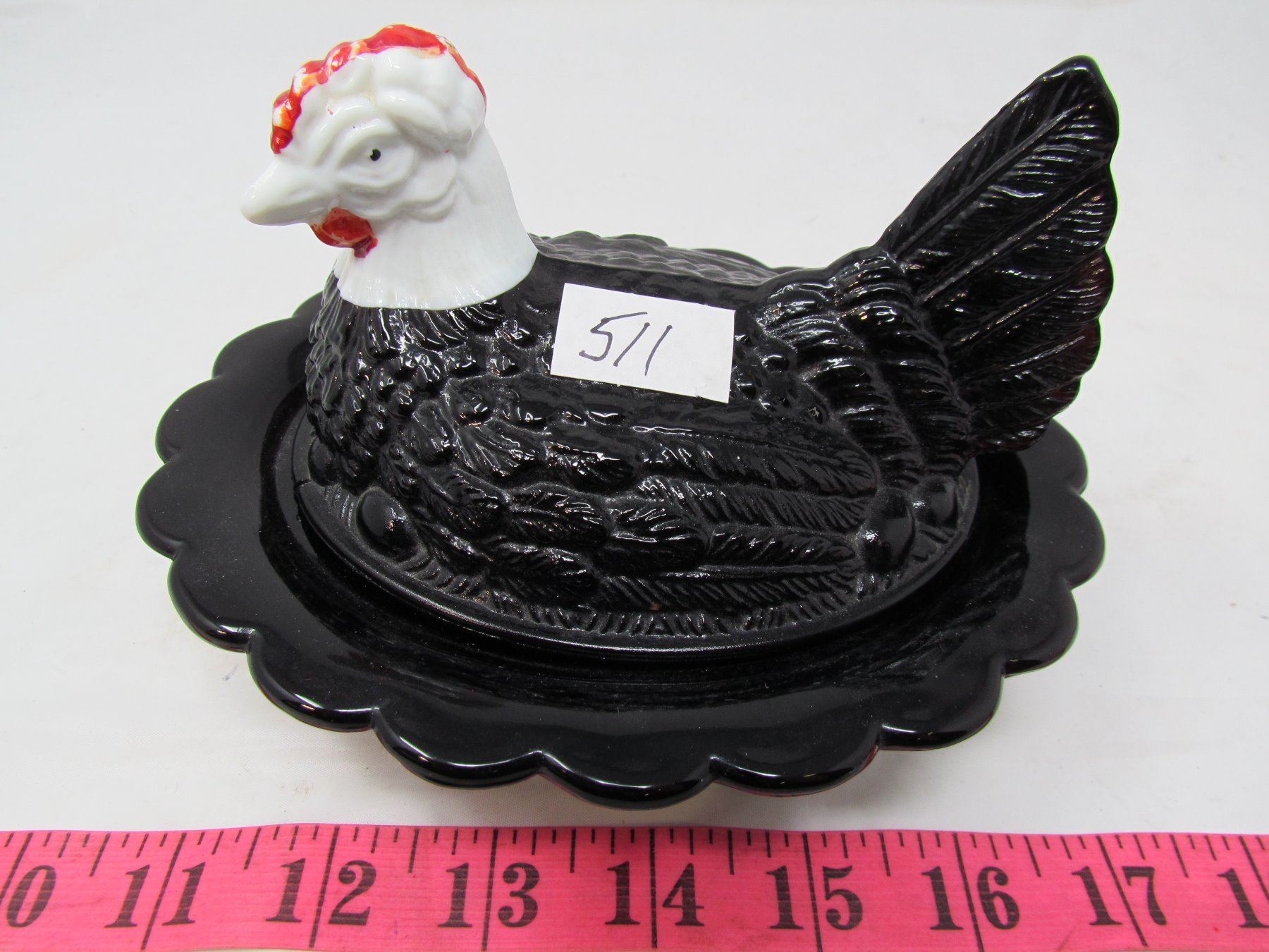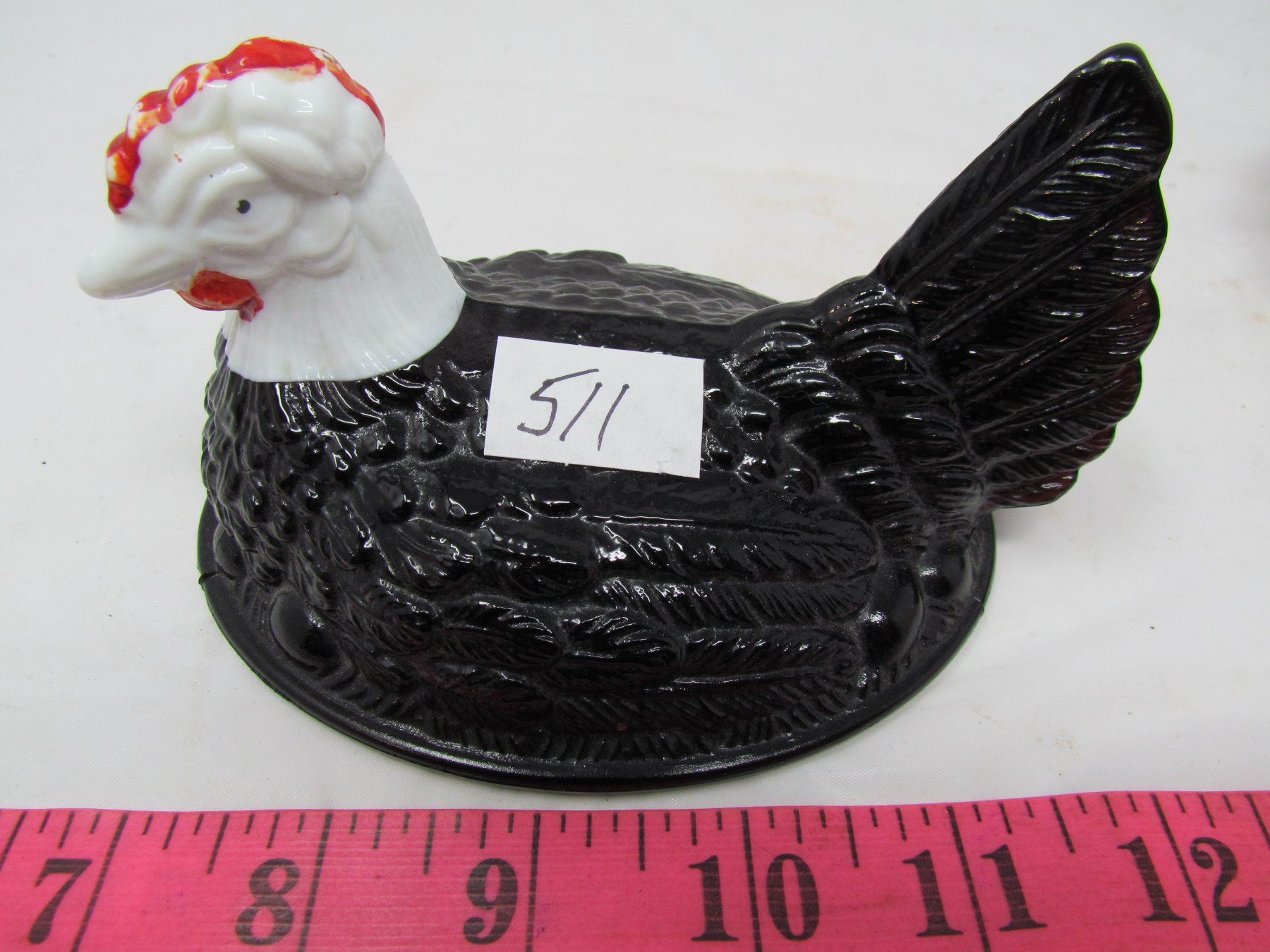 HEN ON NEST, BLACK GLASS, HAND DECORATED
