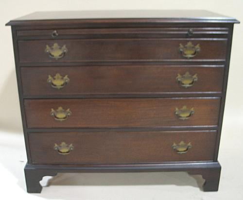 HENKEL-HARRIS MAHOGANY SERVER. Paper label at back reads Style No. 24, Shade No. 14. Four graduated drawers with slide-out at top. Bracket feet. Minor surface scratching throughout. 34.5” H, 38.5” W, 19” D