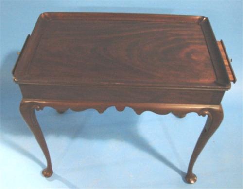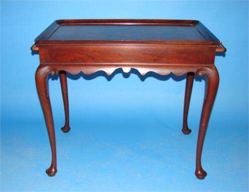 HENKEL-HARRIS MAHOGANY QUEEN ANNE STYLE TEA TABLE. Has molded top and candle slides at both ends. Scalloped apron. Branded with mark on bottom. Shows minor surface scratching at top. 26.75" H, 29.5" W, 18" D