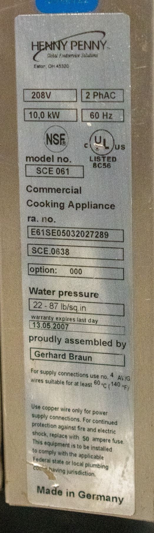 MODEL # SCE 061, 208 VOLTS, 2 PHAC, 10.0 KW, 60 HZ, 33.5" X 30.5" X 30"