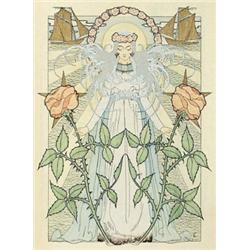 Richepin, Jean; Les Litanies de la Mer. Mit 56 aquarellierten, meist gold- und/bzw. silbergehöhten Strichätzungen (einschl. 2 Umschlag- und 1 Titelblattillustr.; davon 5 ganzseitig, nur mit gedrucktem Titel) nach Aquarellen Caruchets sowie franz. Text. Paris, Albert Bélinac, 1903. 4<SUP>o</SUP>. Goldgepr. priv. Ldbd. (dunkelblaues Maroquin) mit eingebundenem illustr. Orig.-Umschlag und Goldschnitt in priv. HLd.-Schuber. 53 SS (num. Bll.). (Saur, AKL Bd. 17, S. 22). - Expl. 91/100 der einzigen Auflage. Im Impressum <U>monogrammiert</U> “L. G.” und numeriert. Meist mit dem Namenszug (1) bzw. Monogramm in der Darstellung sowie gedrucktem Text. Auf chamoisfarbenem Japan. Der von Noulhac gestaltete Einband an den Kanten stellenweise geringfügig berieben. Vereinzelt mit winzigen Stockflecken an den Rändern. Seltene und schöne französische Jugendstilpublikation mit den in zarten Farbtönen gehaltenen filigranen Illustrationen Caruchets, deren künstlerische Aquarellierung durch das Maison Establie erfolgte und die in einem bemerkenswert farbfrischen Erhaltungszustand sind.