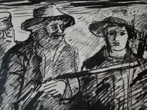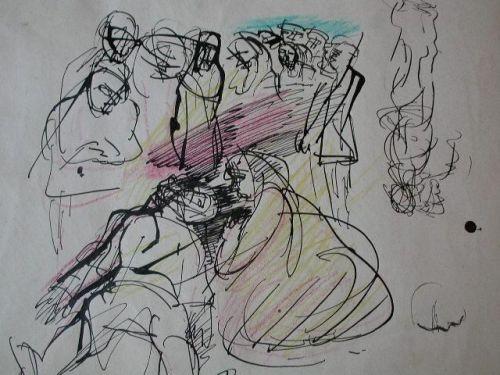 On the back side there is a second drawing, this time in black ink and color pastel, descrabing a scene where a man is laying on the ground and a woman is praying next to him. also there is a group of people in the background.