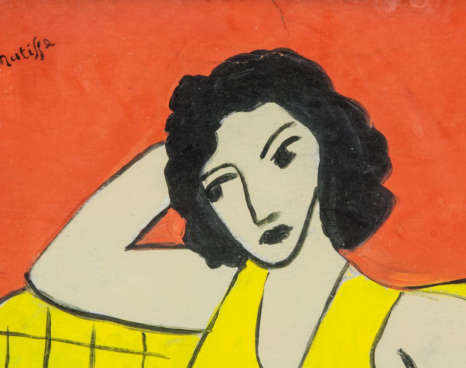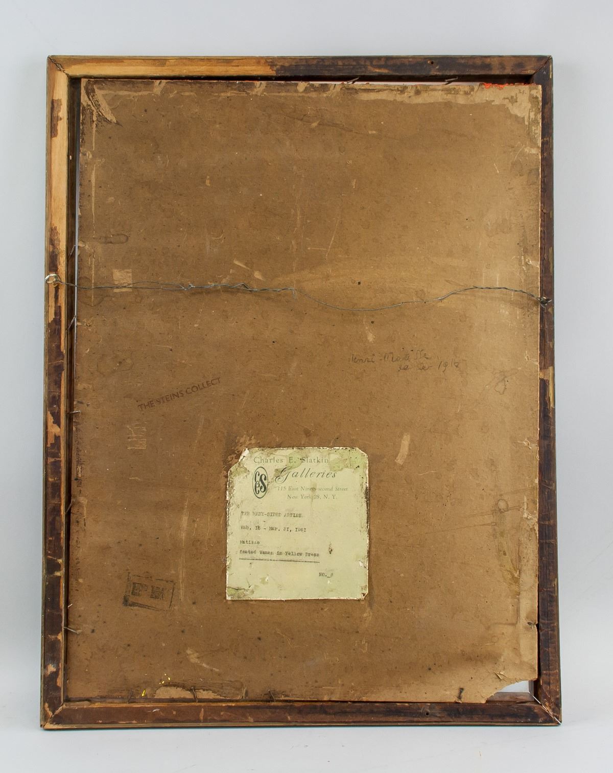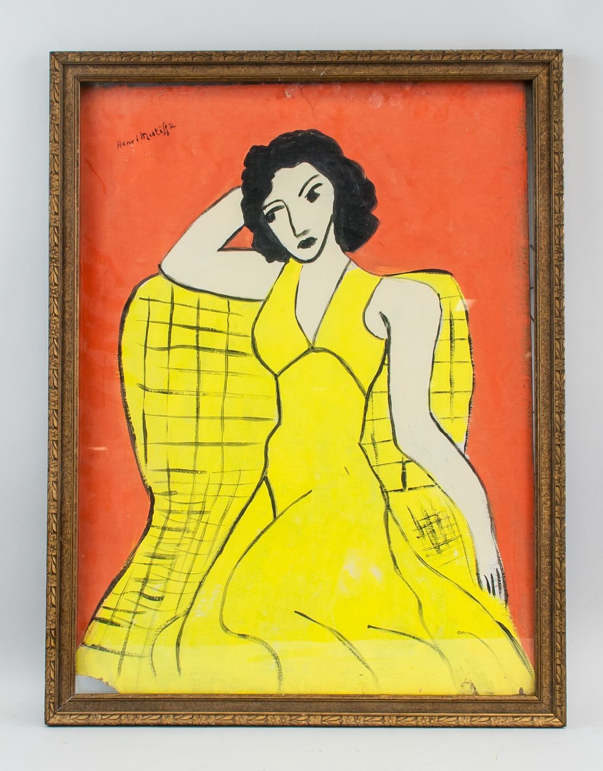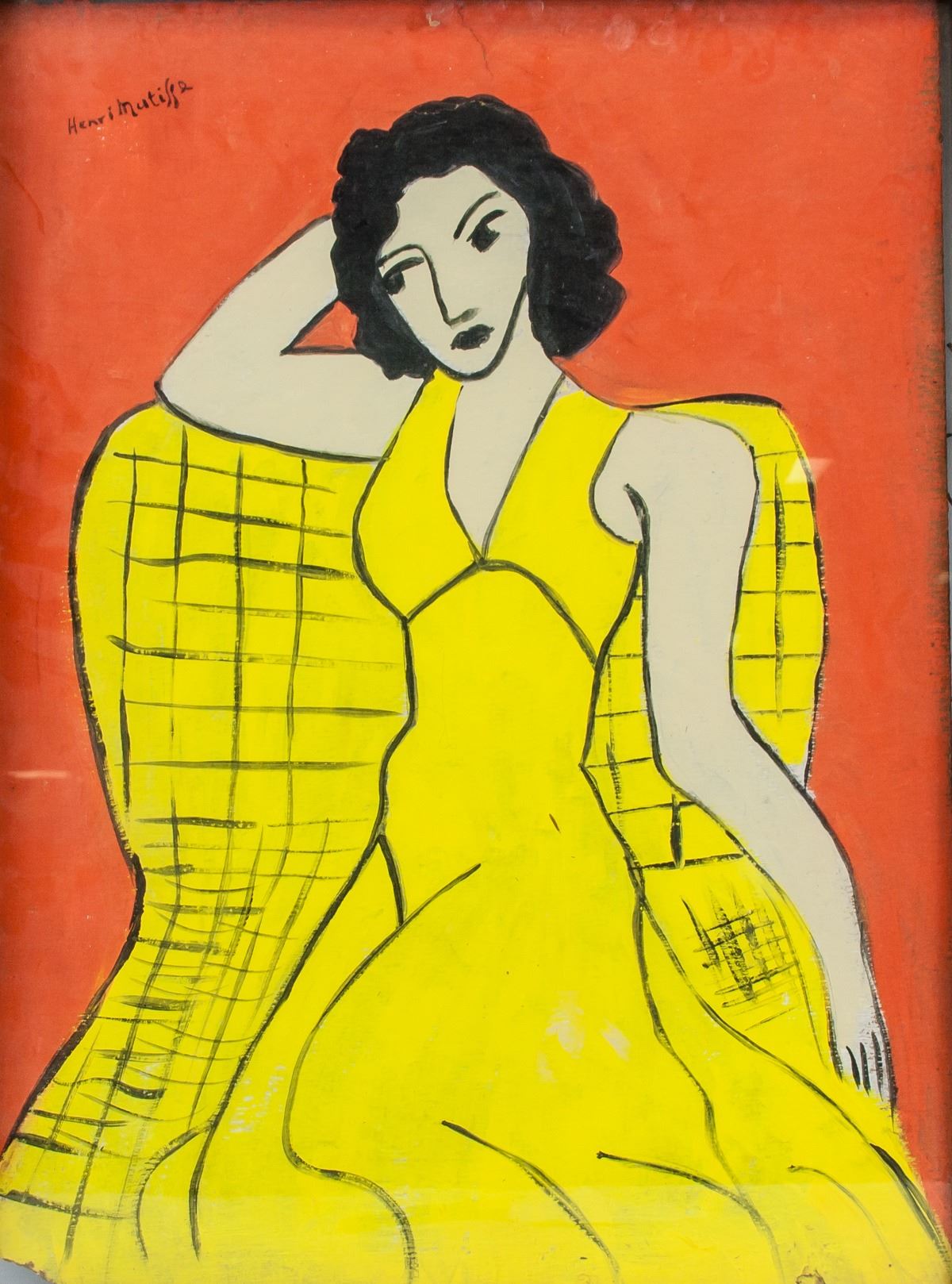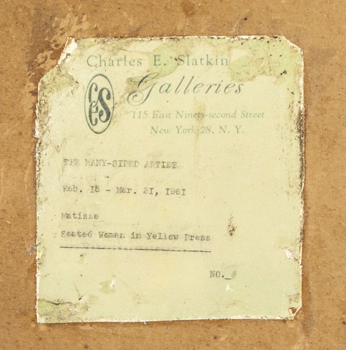 Gouache on board, framed. Featuring a portrait and entitled, "Seated Women in Yellow Dress." Signed and attr. Henri Matisse (French, 1869-1954) on the upper right corner. Gallery label for exhibtion, "The Many-Sided Artist on verso with title and exhibition date Feb. 15 - Mar. 31, 1961. 55 x 40 cm (21.7 x 15.8 inches). Frame size: 60 x 46 cm (23.6 x 18.1 inches). The Steins Collect and artist name with date 1916 stamped and inscribed in pencil on verso. Henri Matisse was one of the most influential French artists of the 20th century. Matisse’s lyrical colors, inventive figuration, and use of decorative patterns helped redefine many of the formal tenets of painting. “What I dream of is an art of balance, of purity and serenity, devoid of troubling or depressing subject-matter,” he once said. Born Henri-emile-Benoît Matisse on December 31, 1869 in Le Cateau-Cambresis, France, he took to art relatively late in life after initially pursuing law. First studying painting under Gustave Moreau at the ecole des Beaux-Arts, he soon adopted the Pointillist ideas espoused by Georges Seurat and Paul Signac. With Pointillism as a point of departure, Matisse along with Albert Marquet and Andre Derain, developed a radical method of using pure color to express light, in what became known as Fauvism. Matisse would return to a style which incorporated both naturalistic and decorative elements, as evinced in his painting Goldfish (1911). In the decades that followed, the artist spent much of his time in the South of France, painting models dressed as odalisques and ocean views from his hotel room. Late in his career, while bed-ridden and unable to paint, Matisse produced a number of cutout paper works such as Blue Nude II (1952). The artist died on November 3, 1954 in Nice, France. His experimentation with flat areas of unmodulated color was a major source of inspiration for Milton Avery, Richard Diebenkorn, and David Hockney. Today, Matisse’s works are held in the collections of the Hermitage Museum in St. Petersburg, the Musee d’Orsay in Paris, The Museum of Modern Art in New York, and the National Gallery in London. PROVENANCE: Charles E. Slatkin Galleries (New York, United States). Acquired by the current owner (New York, circa 2000s).