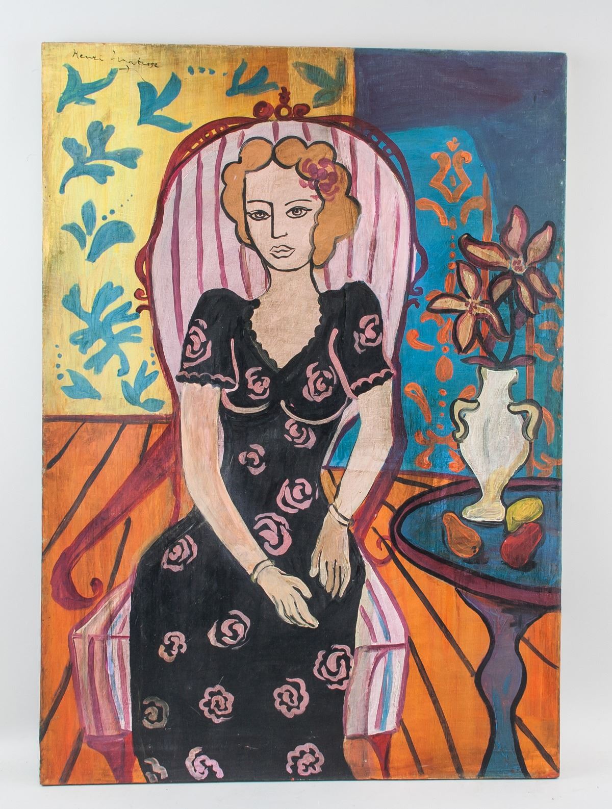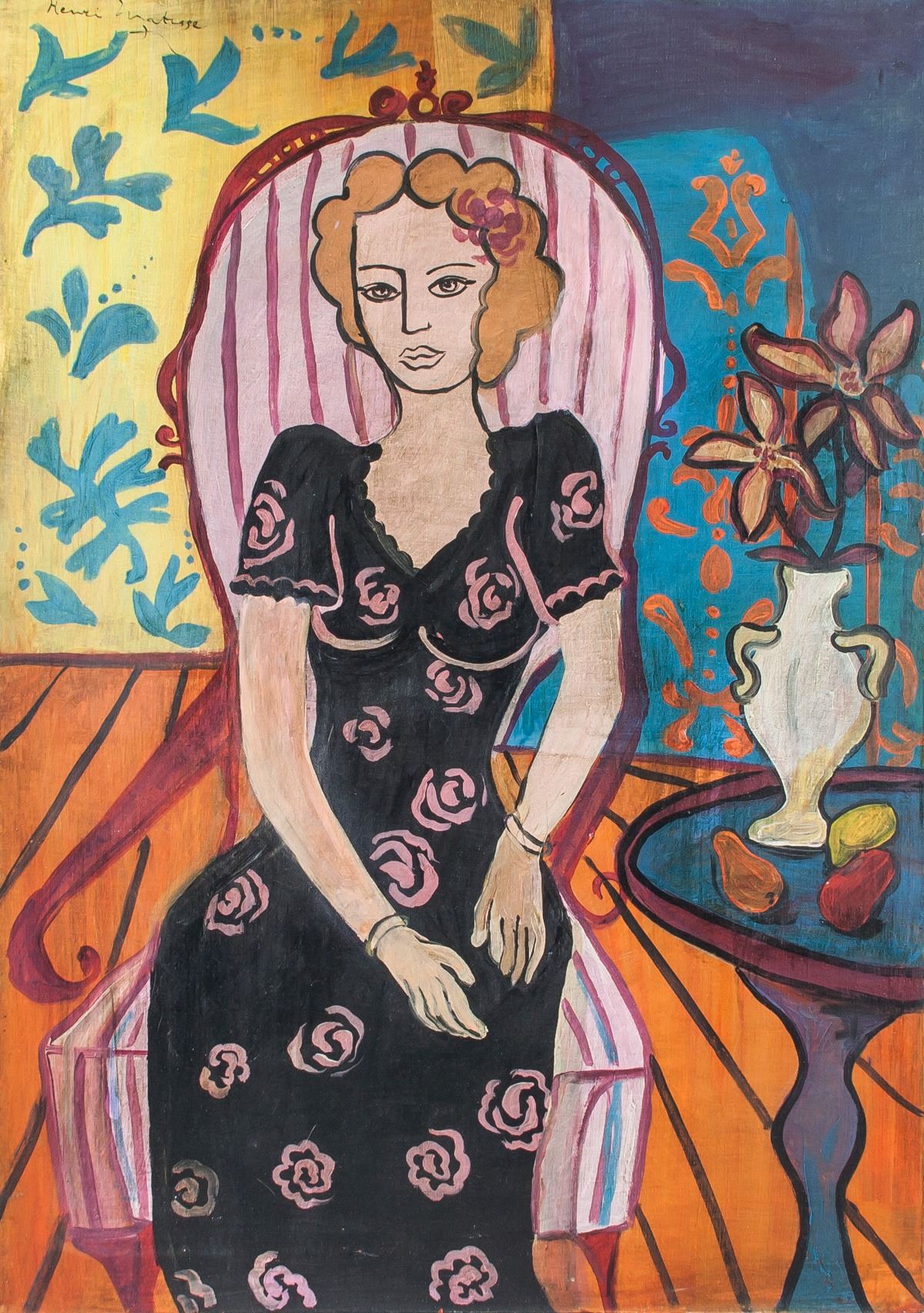 Oil on canvas. Featuring a portrait of a lady seated. Signed and attr. Henri Matisse (French, 1869-1954) on the upper left corner. Gallery label with notation on verso. 75 x 54 cm (29.5 x 21.3 inches). Henri Matisse was one of the most influential French artists of the 20th century. Matisse’s lyrical colors, inventive figuration, and use of decorative patterns helped redefine many of the formal tenets of painting. “What I dream of is an art of balance, of purity and serenity, devoid of troubling or depressing subject-matter,” he once said. Born Henri-emile-Benoît Matisse on December 31, 1869 in Le Cateau-Cambresis, France, he took to art relatively late in life after initially pursuing law. First studying painting under Gustave Moreau at the ecole des Beaux-Arts, he soon adopted the Pointillist ideas espoused by Georges Seurat and Paul Signac. With Pointillism as a point of departure, Matisse along with Albert Marquet and Andre Derain, developed a radical method of using pure color to express light, in what became known as Fauvism. Matisse would return to a style which incorporated both naturalistic and decorative elements, as evinced in his painting Goldfish (1911). In the decades that followed, the artist spent much of his time in the South of France, painting models dressed as odalisques and ocean views from his hotel room. Late in his career, while bed-ridden and unable to paint, Matisse produced a number of cutout paper works such as Blue Nude II (1952). The artist died on November 3, 1954 in Nice, France. His experimentation with flat areas of unmodulated color was a major source of inspiration for Milton Avery, Richard Diebenkorn, and David Hockney. Today, Matisse’s works are held in the collections of the Hermitage Museum in St. Petersburg, the Musee d’Orsay in Paris, The Museum of Modern Art in New York, and the National Gallery in London. PROVENANCE: Beiersdorf Gallery. Private estate, Circa 2000s (Central Europe).