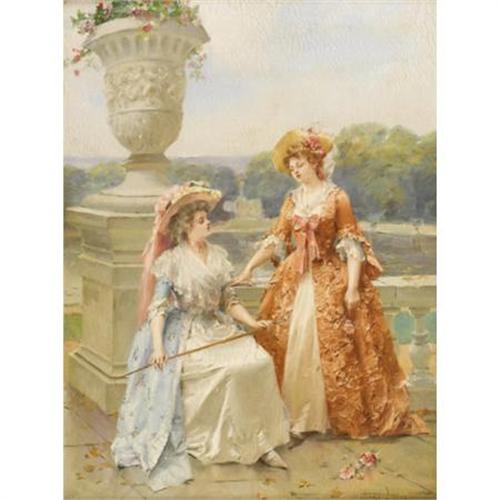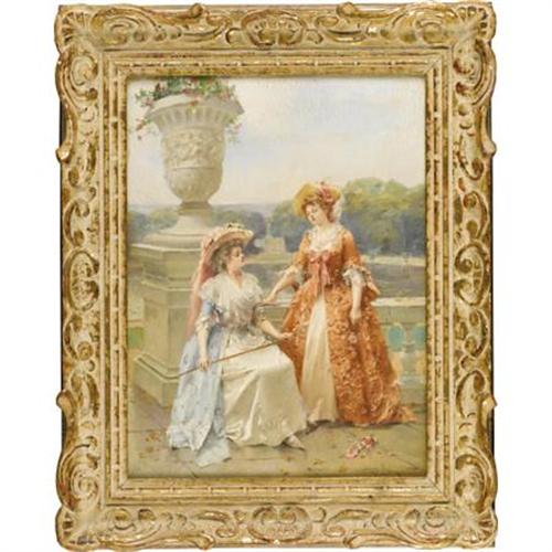 <B>HENRI VICTOR LESUR </B></I>(French 1863-1900)<BR><I>Untitled (Courtyard with Maidens) </B></I><BR>Oil on panel<BR>Signed lower right: <I>Henri Lesur </B></I><BR>In chalk verso: <I>887 </B></I><BR>16-1/4 x 12-3/4 inches (41.1 x 32.4 cm)<BR> <BR>Provenance:<BR>Harry Knippel, Dallas<BR>Crow Art Partnership Collection, Dallas, Texas<BR><BR>Henri Victor Lesur was born in Roubaix, France in 1863 and was educated at the Écôle des Beaux Arts before he debuted at the Salon in 1887, where he won a medal for his submission. He was awarded medals for his portraits at the 1889 and 1900 Expositions Universelles as well. In addition to his primary artistic focus, Lesur also painted genre scenes of fashionably dressed women such as the two young ladies in the present courtyard vista. Lesur enjoyed depicting the more playful side of French society and he did so with a vivid use of color. He exhibited at the Salon for the last time in 1895, five years before his death.<BR> <BR><BR><B>Condition Report:</B> Abrasion from frame to outer-most perimeter. Painting has a discolored border due to direct contact with a frame.<BR><BR><b>Shipping:</b> Requires 3rd Party Shipping (<a target="_blank" href="http://www.heritageauctions.com/common/shipping.php">view shipping information</a>)