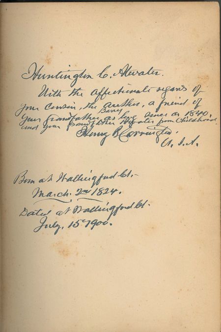 (1824 - 1912) Union brigadier general placed in command of the Mountain District, a military department created to include the Powder River country, through which the Bozeman Trail had been forged. When Carrington arrived with the Second Battalion, 18th Infantry, to garrison the new trail, he underestimated Lakota and Cheyenne resistance to the incursion and invasion, and what became known as "Red Cloud's War" began on July 9, 1866, when Carrington marched north of Fort Connor. He also oversaw the disastrous Fetterman Battle, and spent much of the rest of his life trying to salvage his reputation in the wake of that overwhelming defeat. Signed book written by Carrington, Washington the Soldier, Lamson, Wolffe & Co.: New York, 1898, first edition. On the front flyleaf Carrington pens a lengthy inscription, adding: "Born at Wallingford Ct. March 2nd 1824 Dated at Wallingford Ct. July 15, 1900". Light, scattered foxing on the first few pages, else very good.