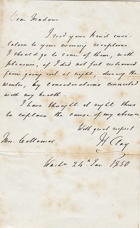 (1777-1852) American politician, the "Great Pacificator" who supported the Missouri Compromise and the Compromise of 1850 which sought to avoid a Civil War on the issue of states' rights and slavery. A.L.S. 1p. 4 1/8" X 6 5/8", Washington, Jan. 24, 1850 to a lady. In part: "...I rec'd your kind invitation to your evening reception. I should go to some of them, with pleasure, if I did not feel restrained from going out at night, during the Winter, by considerations connected with my health. I have thought it right thus to explain the cause of my absence...". A few toned spots, else very good.
