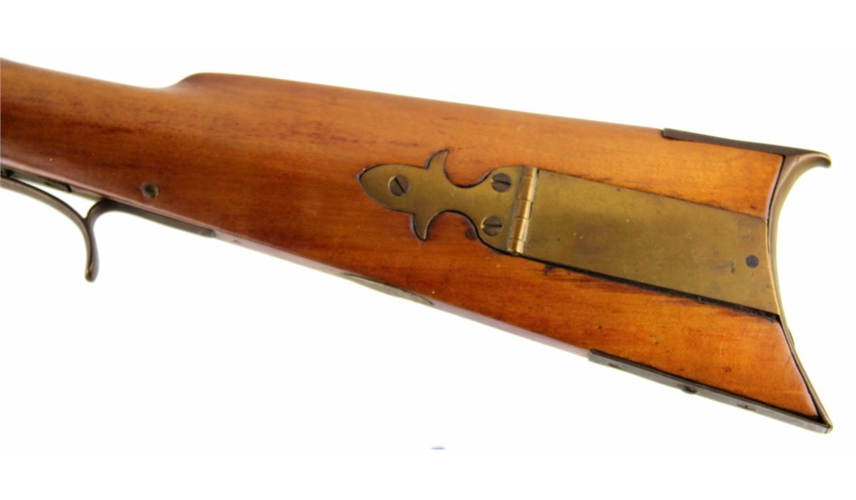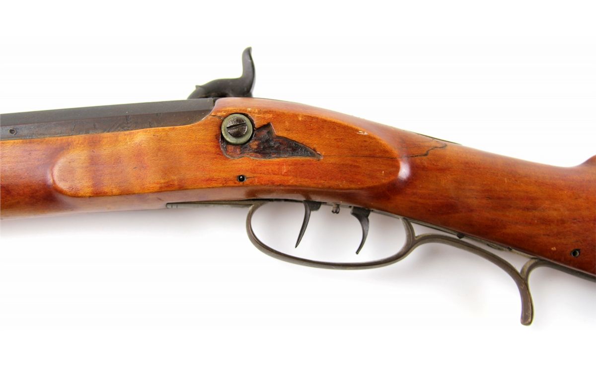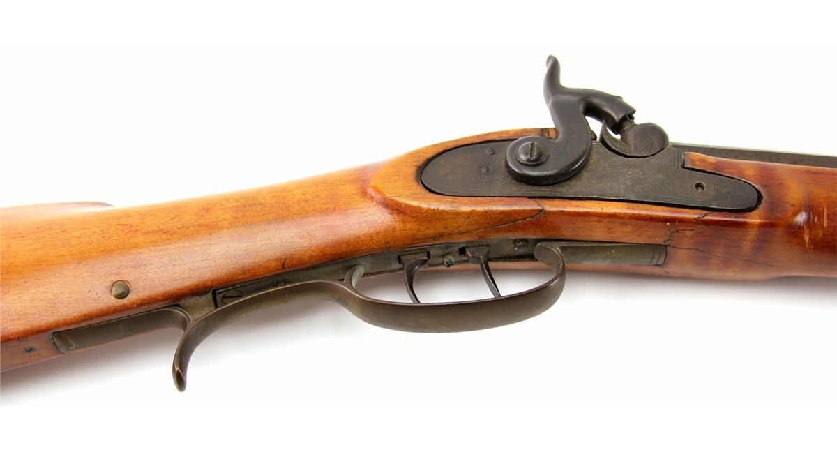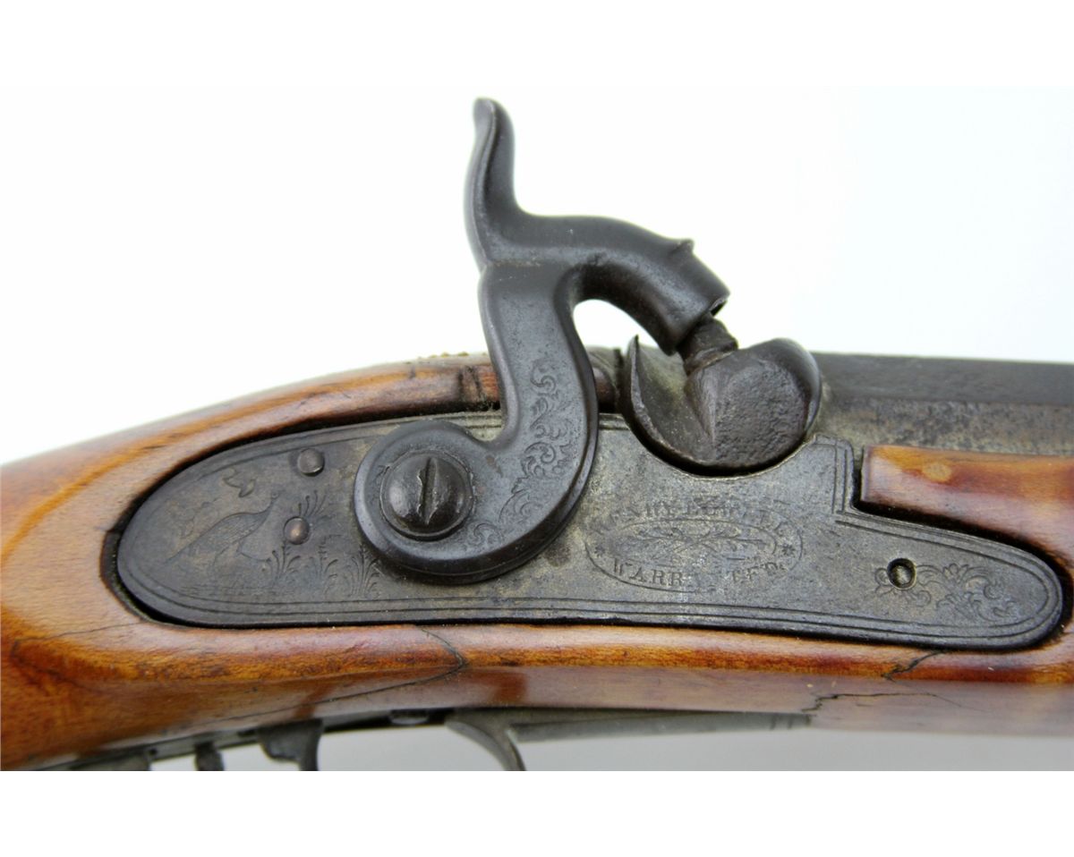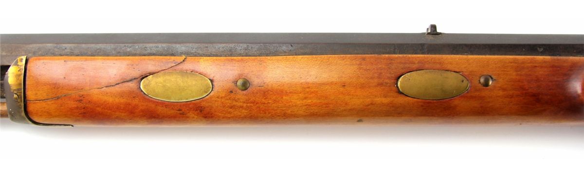 HENRY ELWELL MARKED PERCUSSION RIFLE Set trigger percussion rifle marked "HENRY ELWELL WARRANTED" on lock. A gunsmith by the name Henry Elwell worked as a lock-maker in Seneca County, Ohio, from 1810 to 1812. 40 inch octagonal barrel with .41 caliber bore, and no markings. Brass trigger guard, butt plate, for end cap and patch box. Type: Antique rifle Barrel Length: 40 inch Condition: Dark patina to metal surfaces, and small crack in fore end. Ramrod may be replacement. Lock mechanism functional.