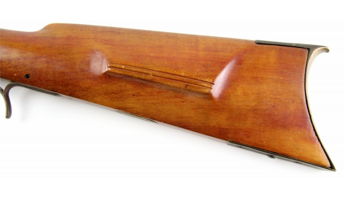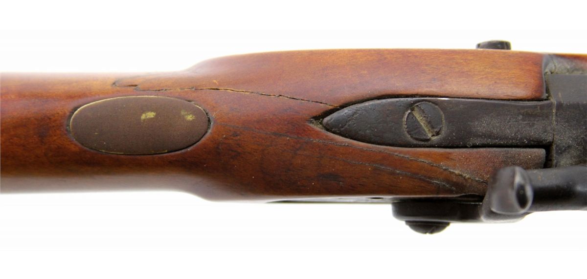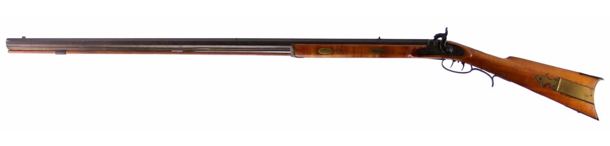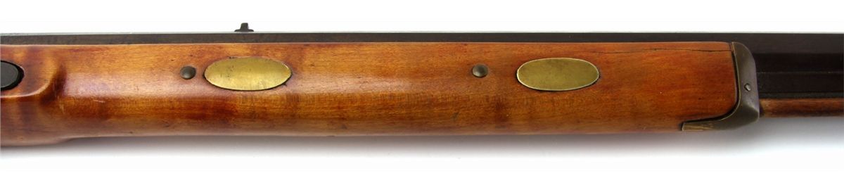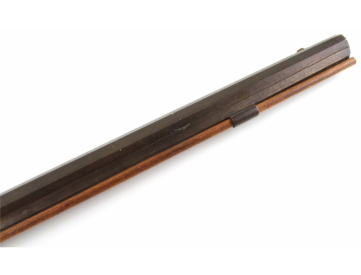 HENRY ELWELL MARKED PERCUSSION RIFLE Set trigger percussion rifle marked "HENRY ELWELL WARRANTED" on lock. A gunsmith by the name Henry Elwell worked as a lock-maker in Seneca County, Ohio, from 1810 to 1812. 40 inch octagonal barrel with .41 caliber bore, and no markings. Brass trigger guard, butt plate, for end cap and patch box. Type: Antique rifle Barrel Length: 40 inch Condition: Dark patina to metal surfaces, and small crack in fore end. Ramrod may be replacement. Lock mechanism functional.
