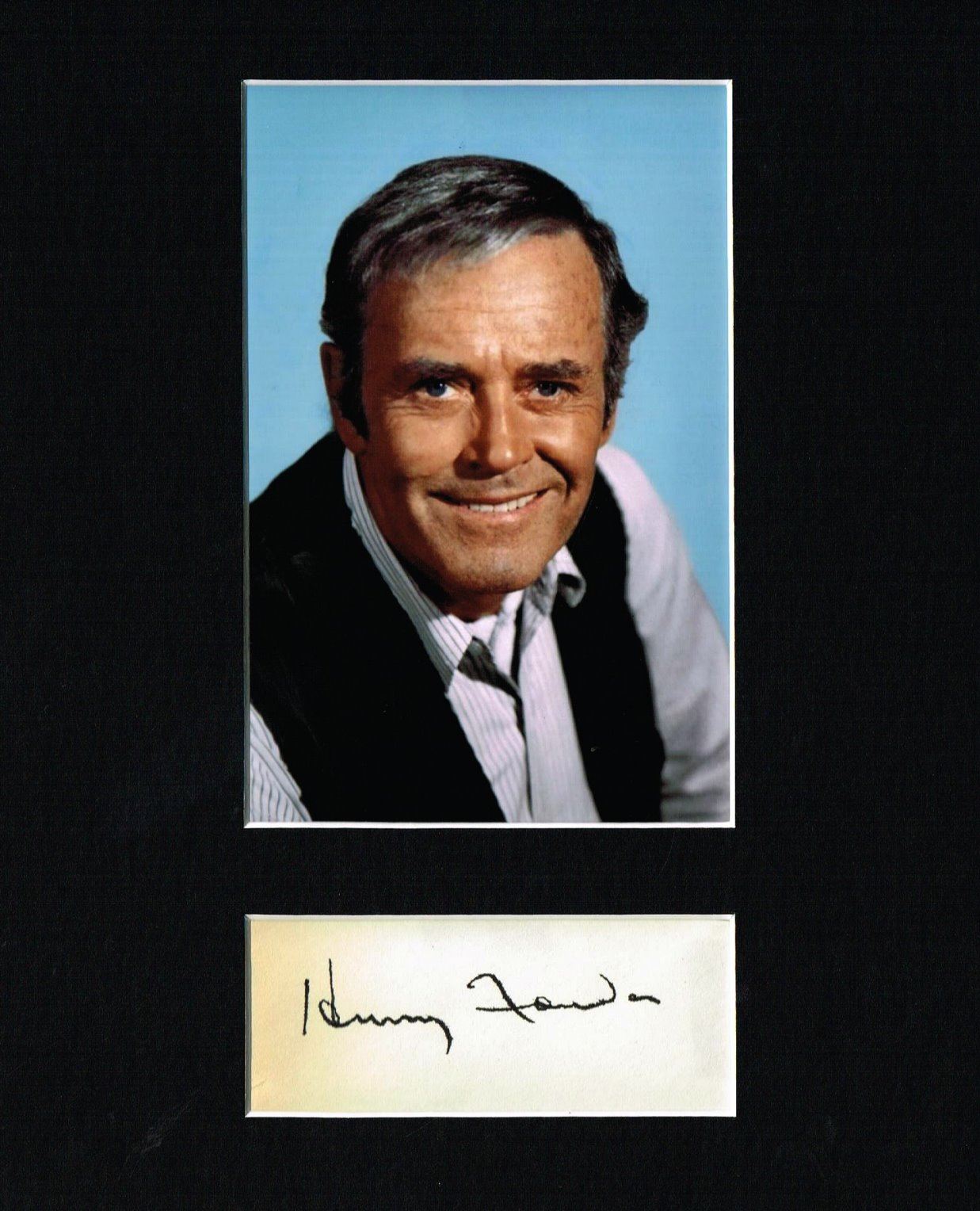 An autograph from Henry Fonda who was an American film actor who had 5 decades in the business. He appeared in screen image in such classics as The Ox-Bow Incident, Mister Roberts, and 12 Angry Men. Later, Fonda moved both toward darker epics such as Sergio Leone's Once Upon a Time in the West and lighter roles in family comedies such as Yours, Mine and Ours with Lucille Ball, winning the Academy Award for Best Actor at the 54th Academy Awards for the movie On Golden Pond, his final film role. Mounted and framed.