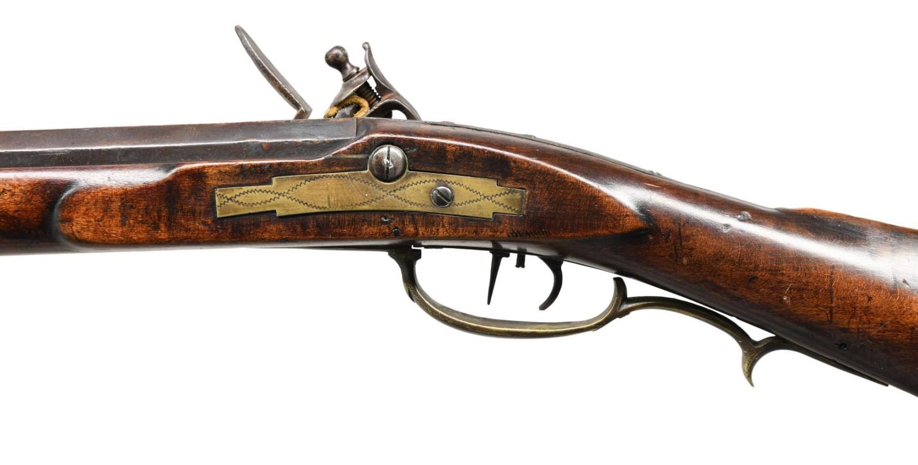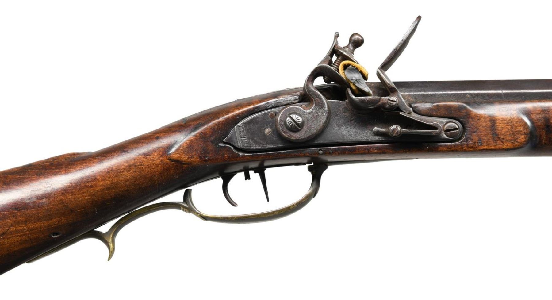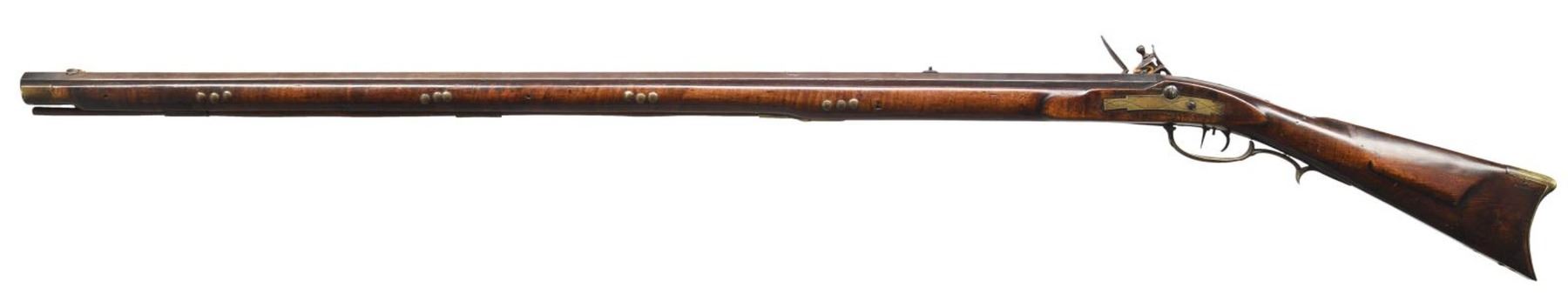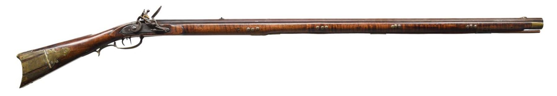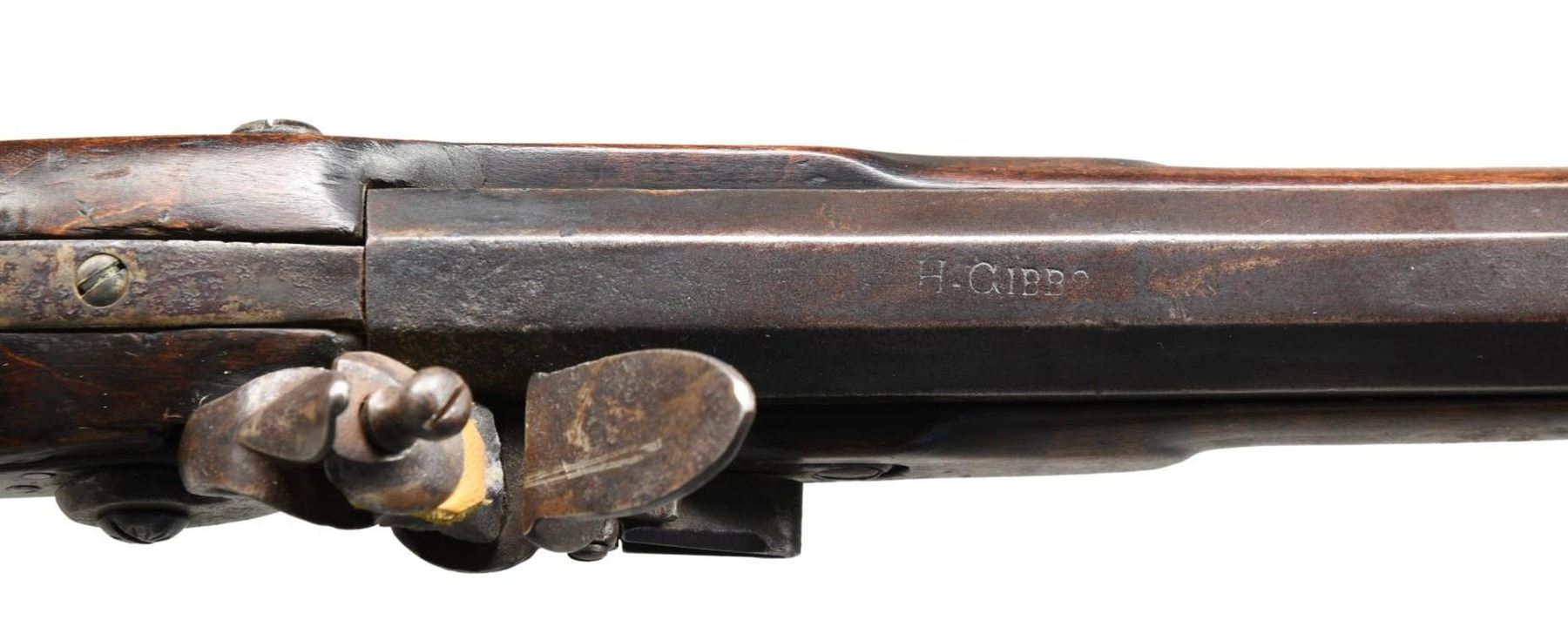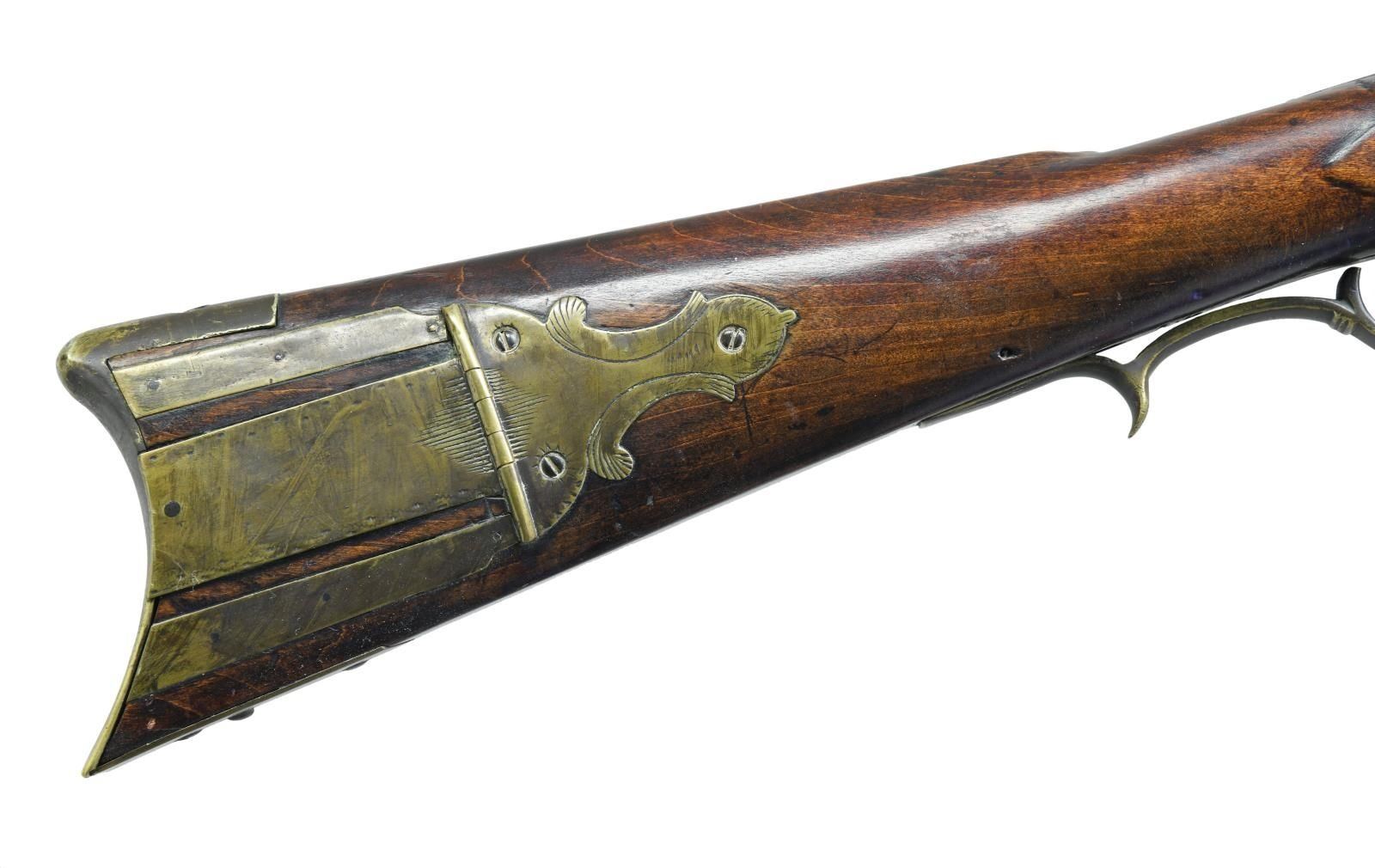 CIRCA 1835. Cal. .54 caliber. NSN. 55" overall. 40" octagonal barrel. Pictured and described on pages 140-141 of "The Fur Trade", author Milton Von Damm: "This rifle meets the general specifications of fur trade rifle contracts between Henry Gibbs and the American Fur Company between 1830 and 1836 for Lancaster or "American" pattern guns. Henry had a son, also named Henry, who made percussion rifles from 1843 to 1880. Indian, or at least western use for this gun is suggested by the old tacks. Note that the trivium patchbox is very similar to the Lancaster pattern rifles by Peter Gonter and Jacob Dickert. There is no maker's name on the lock but H GIBBS is stamped on the top flat of the barrel. The barrel's breech tang extends 5 inches along the top of the stock wrist for added support. This extended tang was an important improvement for trade rifles because the wrist or grip is the most vulnerable part of the stock. The condition of the gun is very good and the lock may be a working life replacement." CONDITION: good to very good. PROVENANCE: Lifelong Collection of author Milton Von Damm. (01-24785/JS). ANTIQUE. $3,000-4,000.
