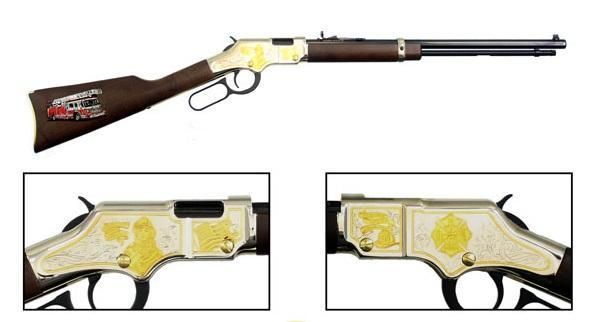 Description:HEN G BOY LVR 22LR FIREMN Manufacturer:Henry Repeating Arms Model #:Golden Boy Fireman Tribute Edition Type:Rifle: Lever Action Finish:Blue Barrel Stock:Walnut with Laser Etched & Hand Painted Truck Sights:Ft:Beaded Rr:Marbles Semi-Buckhorn White Diamond Barrel Length:20" Octagonal Barrel with Brasslite Barrel Band Overall Length:38.5" Weight:6.75 lbs Caliber:22LR Capacity:16+1 Action:Lever Action Packaging:Custom Serial Number Range Receiver:Nickel with 24kt Gold Plated Engravings Features:IN TRIBUTE TO AMERICA'S BRAVEST on Right SERVICE VALOR COURAGE and Maltese Cross on Left