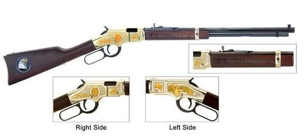 Manufacturer:Henry Repeating Arms Model #:Golden Boy Law Enforcement Tribute Edition Type:Rifle: Lever Action Finish:Blue Barrel, Brasslite Receiver Stock:Walnut, Eagle and God Bless America's Finest Sights:Ft:Beaded Rr:Marbles Semi-Buckhorn White Diamond Barrel Length:20" Octagonal Barrel with Barrel Band Overall Length:38.5" Weight:6.75 lbs Caliber:22LR Capacity:16+1 Action:Lever Action Packaging:Custom Serial Number Range Receiver:24kt Gold Plated Engravings Features:Right: LE Badge, Hat, Handcuffs and Gold Banner Left: Michael the Archangel and American Flag