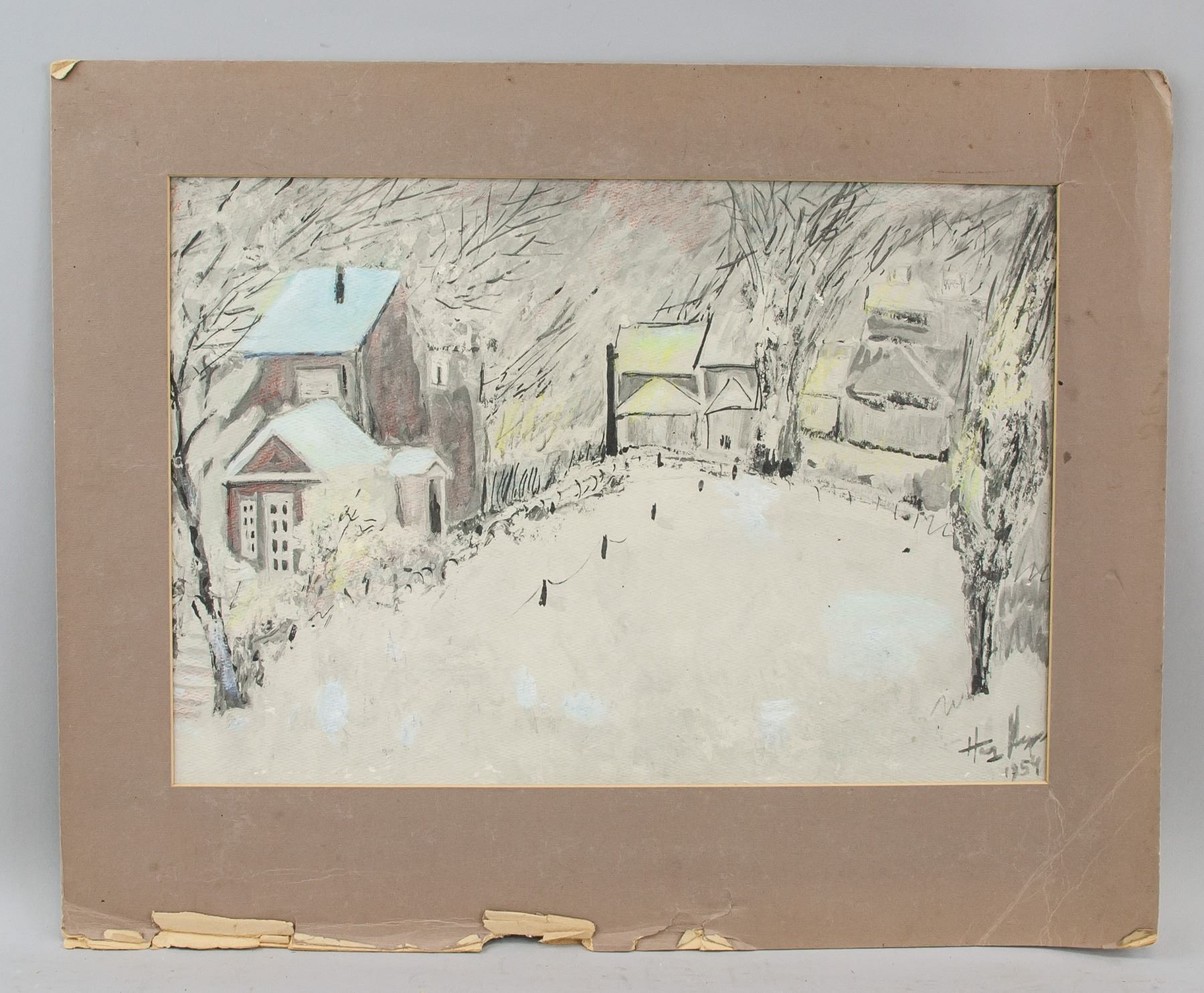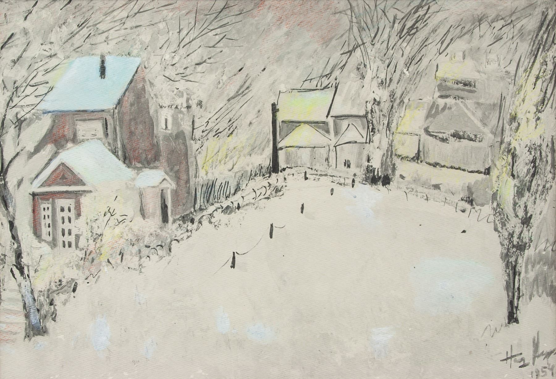 Oil on board. Featuring a landscape winter scene. Signed and attr. Henry Hoeni (Canadian, 1917-1989) on the lower right corner, dated 1954. 28 x 40 cm (11 x 15..8 inches)