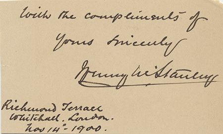 (1841 - 1904) British journalist and explorer who discovered Dr. Livingstone at Ujiji. Bold sentiment and signature penned on a small card, in full: "with the compliments of yours sincerely Henry M. Stanley Richmond Terrace, Whitehall, London, Nov. 14th 1900". Mounting traces to verso, otherwise very good.