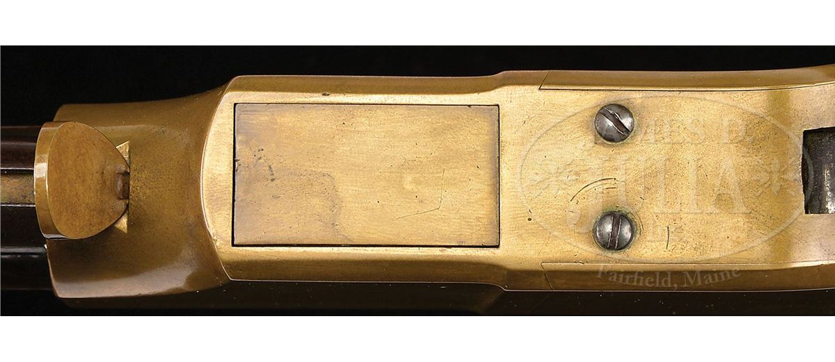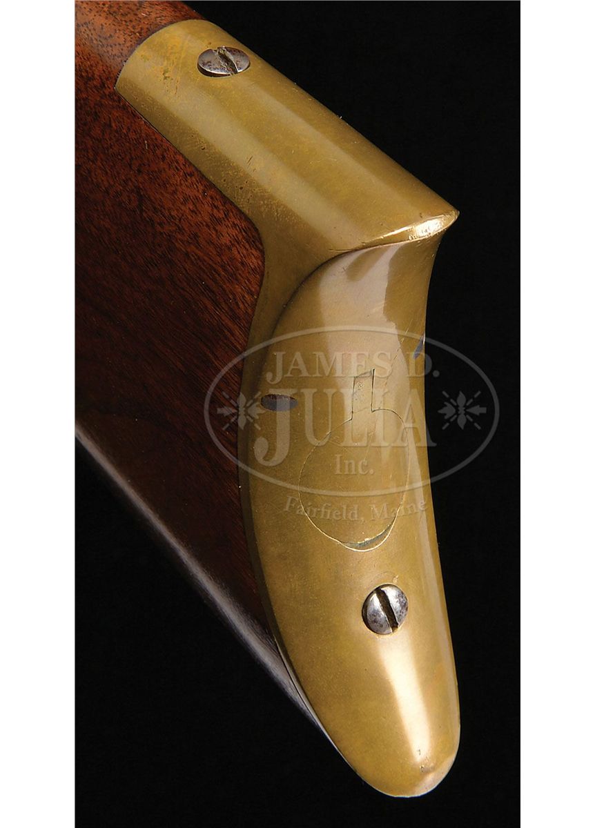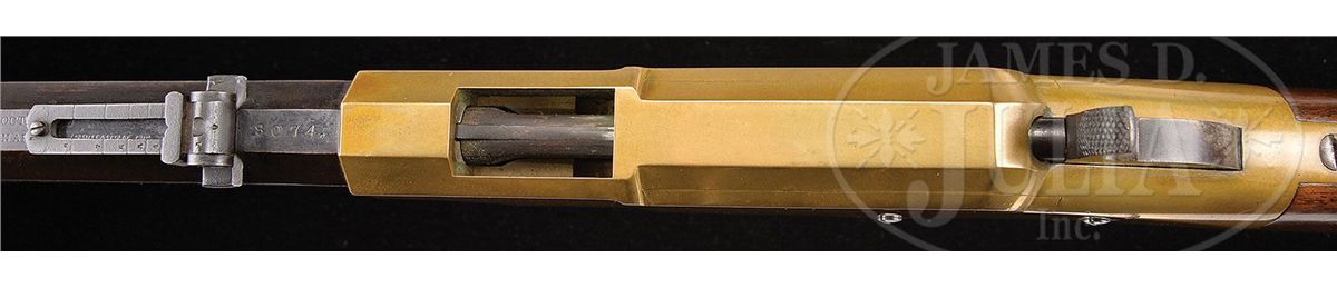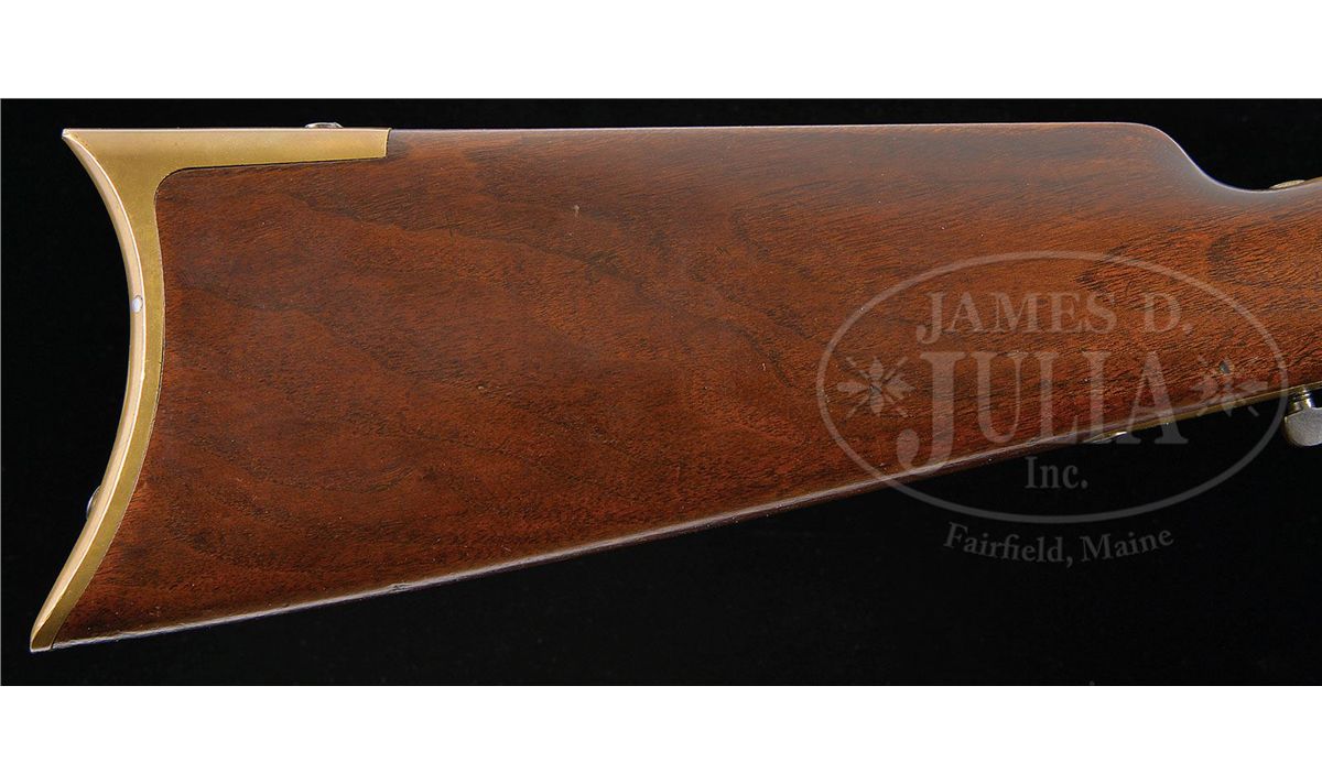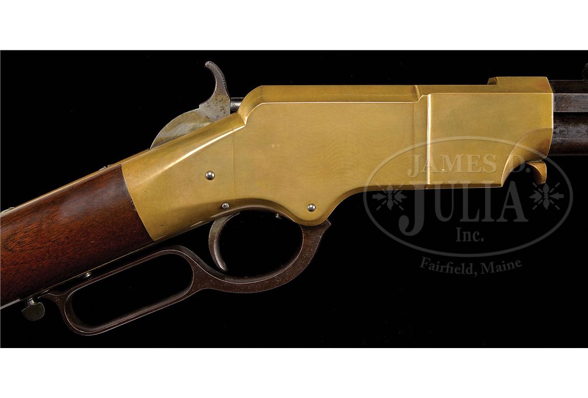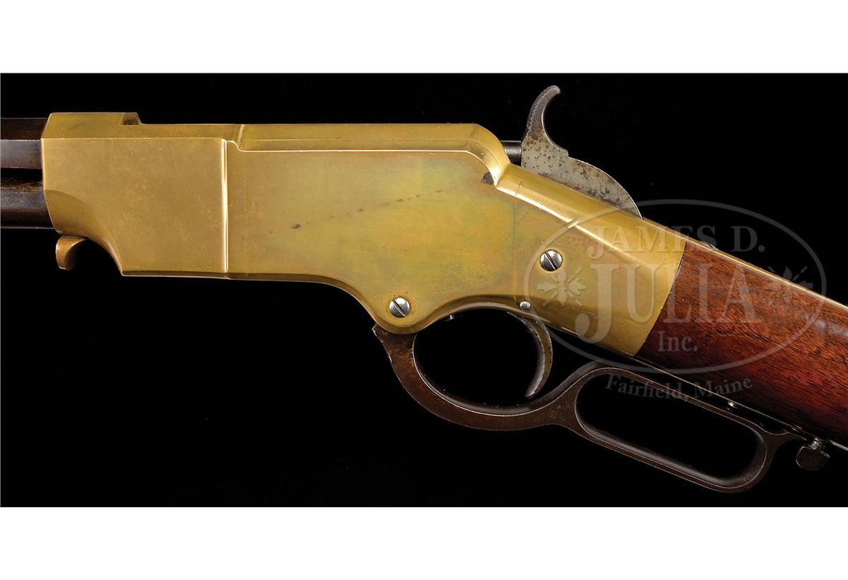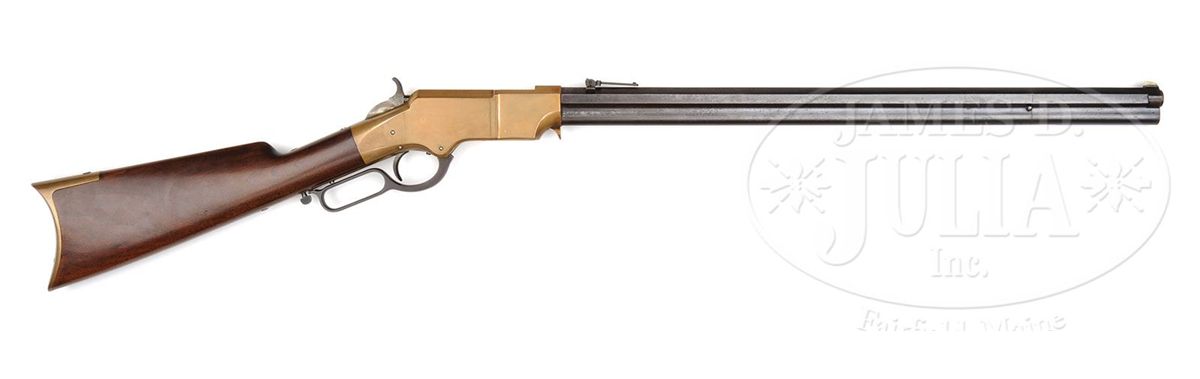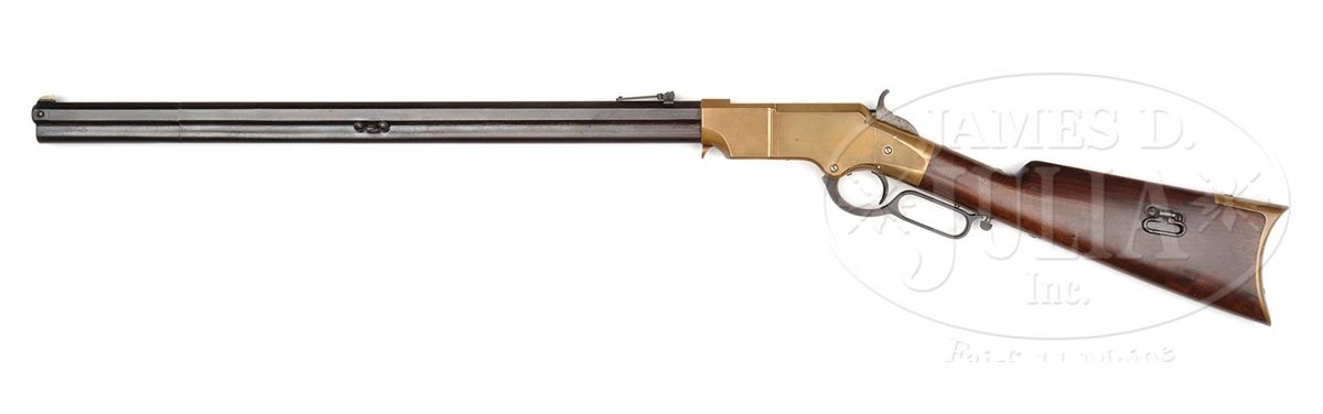 SN 8074. Cal. 44 RF Henry. Standard Henry rifle with 24-1/4" oct bbl with integral magazine, late style, square back German silver front sight and 900 yd. Henry ladder rear sight. Top flat of the bbl has the large size 2-line Henry address. Mounted with uncheckered, slab sawed American walnut with straight stock and 2nd type brass crescent buttplate with pointed heel and trap containing an orig brass & iron 4-pc cleaning rod. Left side of buttstock has a factory swing loop with corresponding loop on left side of bbl. Below the buttstock sling loop is the pronounced "Henry bump". Rnd part of the bbl, under the loading sleeve is marked with the assembly number "654" with matching assembly number on rear face of loading sleeve. Henry rifles were extremely popular throughout the Civil War and later on the American frontier well into the advent of center fire, repeating rifles. Even after that a large number of them found their way to Mexico and South America where they saw further service under worse conditions, usually with little or no maintenance. Henry rifles today are rarely found with any orig finish. PROVENANCE: Woody Frey Collection. CONDITION: Fine to very fine, all matching. Bbl & magazine tube retain traces of orig blue in the gullets with the balance a dark plum patina. Receiver was cleaned a long time ago and now has a light mustard patina. Wood is sound with a few light handling & storage nicks & scratches and retains about all of a fine restored finish. Mechanics are crisp, strong sharp bore with good rifling and good shine with fine pitting. Bolt is missing its face. Cleaning rod is extremely fine. 4-48402 JR202