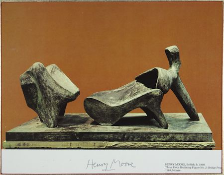 (1898 - 1986) British sculptor of abstract works in bronze and stone, often on a monumental scale. Fine signed color image of his one of his sculptures from 1963 "Three Piece Reclining Figure Number 2", 13" x 10" on cardstock. Very good condition, but somewhat crudely matted. Worthy of re-framing.