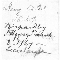 (1736 - 1799) American Revolutionary leader, with Jefferson and Lee initiated the Committee of Correspondence, member of the Continental Congress, remembered for his famous quote "Give me liberty, or give me death!" Scarce A.E.S. with a rare signature variant "P. Henry Jr." on the verso of a manuscript receipt 1p. oblong 12mo. Hanover, [Va.], 1765 for various expenses of the Sheriff of Hanover. Henry notes on the verso: "This paid by P Henry Jr. March 8, 1767". Usual folds, otherwise very good condition.