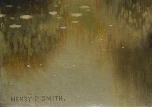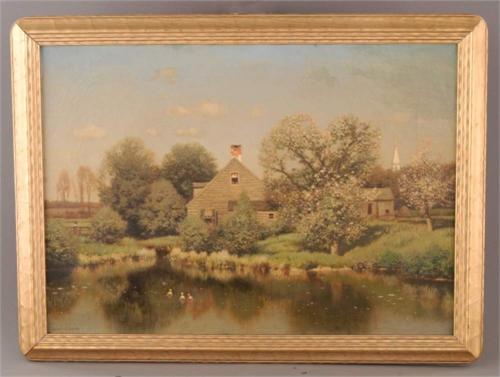 HENRY PEMBER SMITH 20"x28" oil on canvas cottage across a pond with ducks and a figure circa 1900 <BR>condition: two small punctures (1cm x 1cm) at edges with inpainted repairs, crazing, dirty