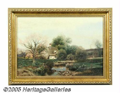 <B>HENRY PEMBER SMITH (American 1854-1907)</B></I><BR>Cottage by a Duck Pond<BR>Oil on canvas<BR>14in. x 20in.<BR><BR>Condition Report: Unlined original canvas, stretcher bar indentation across top, craquelure throughout sky, canvas in deteriorated condition, many tiny loss areas throughout, overall surface dirt<BR>