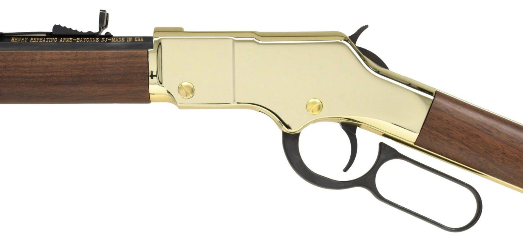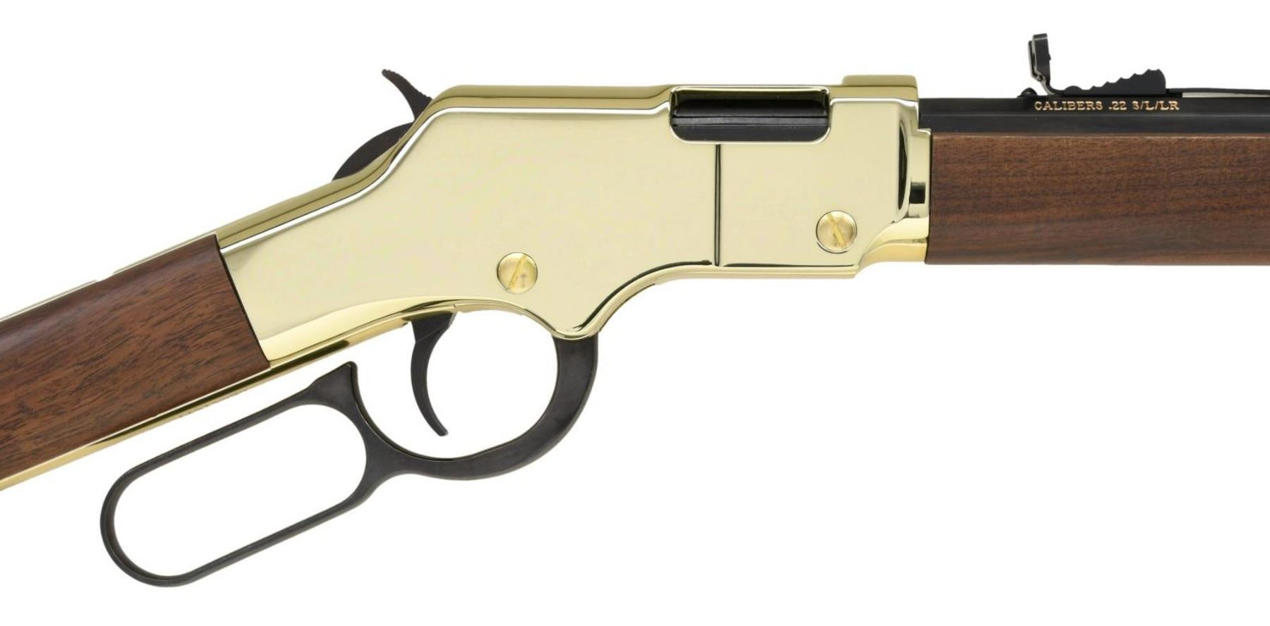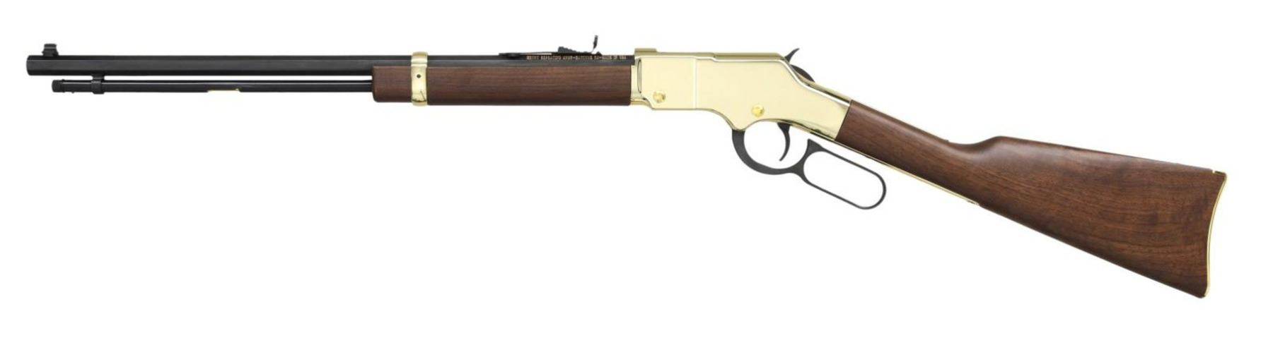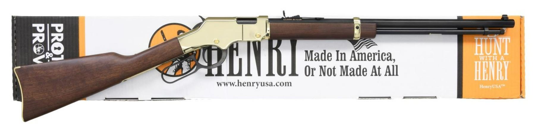 ACTION RIFLE WITH MATCHING FACTORY BOX. Cal. 22 LR. S# GB841577. Bbl. 20". Model H004 "Golden Boy" lever action rifle mfg. by Henry Repeating Arms. Left side of the octagonal bbl. is marked with Henry's mfg. information, with the cal. designation on the right. Brass plated receiver, bbl. band, & buttplate, with blued bbl., mag. tube, and lever. Plain wood straight grip buttstock & forend. Brass beaded blade front sight with U-notch rear sight. UNATTACHED ACCESSORIES: matching factory box. CONDITION: near new, with metal components retaining virtually all of their original factory finishes overall, exhibiting some light superficial handling marks. Mirror bore, exhibiting well defined rifling throughout. Wood furniture is excellent. Box shows some mild exterior wear from storage & handling, but otherwise remains sturdy & serviceable. PROVENANCE: the Collection of Gun Sport Ltd owned by Jon R. Thomas. (23-3178/MLW). MODERN. $300-500.
