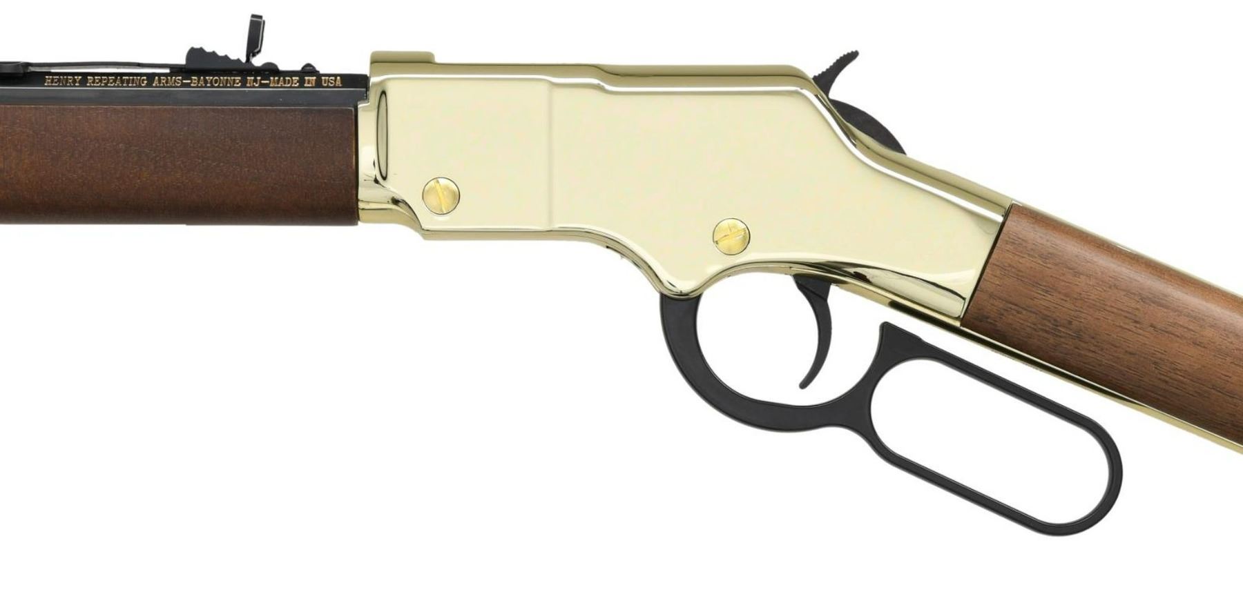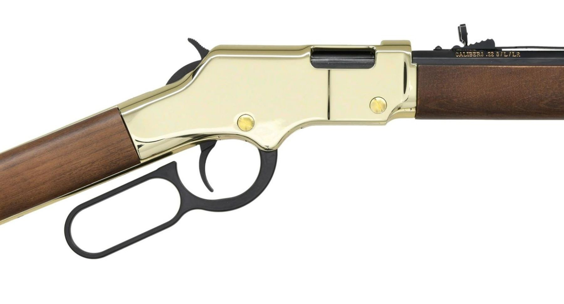 ACTION RIFLE WITH MATCHING FACTORY BOX. Cal. 22 S, L, LR. S# GB839053. Bbl. 20". Model H004 "Golden Boy" lever action rifle mfg. by Henry Repeating Arms. Left side of the octagonal bbl. is marked with Henry's mfg. information, with the cal. designation on the right. Brass plated receiver, bbl., and buttplate, with blued bbl. & mag. tube. Black anodized aluminum lever. Plain wood straight grip buttstock & forend. Brass beaded blade front sight with U-notch rear sight. UNATTACHED ACCESSORIES: matching factory box. CONDITION: near new, with metal components retaining virtually all of their original factory finishes overall. Mirror bore, exhibiting well defined rifling throughout. Wood furniture is excellent overall. Box shows some mild wear and some tearing from handling & storage, but otherwise remains sturdy & serviceable. PROVENANCE: the Collection of Gun Sport Ltd owned by Jon R. Thomas. (23-3190/MLW). MODERN. $300-500.