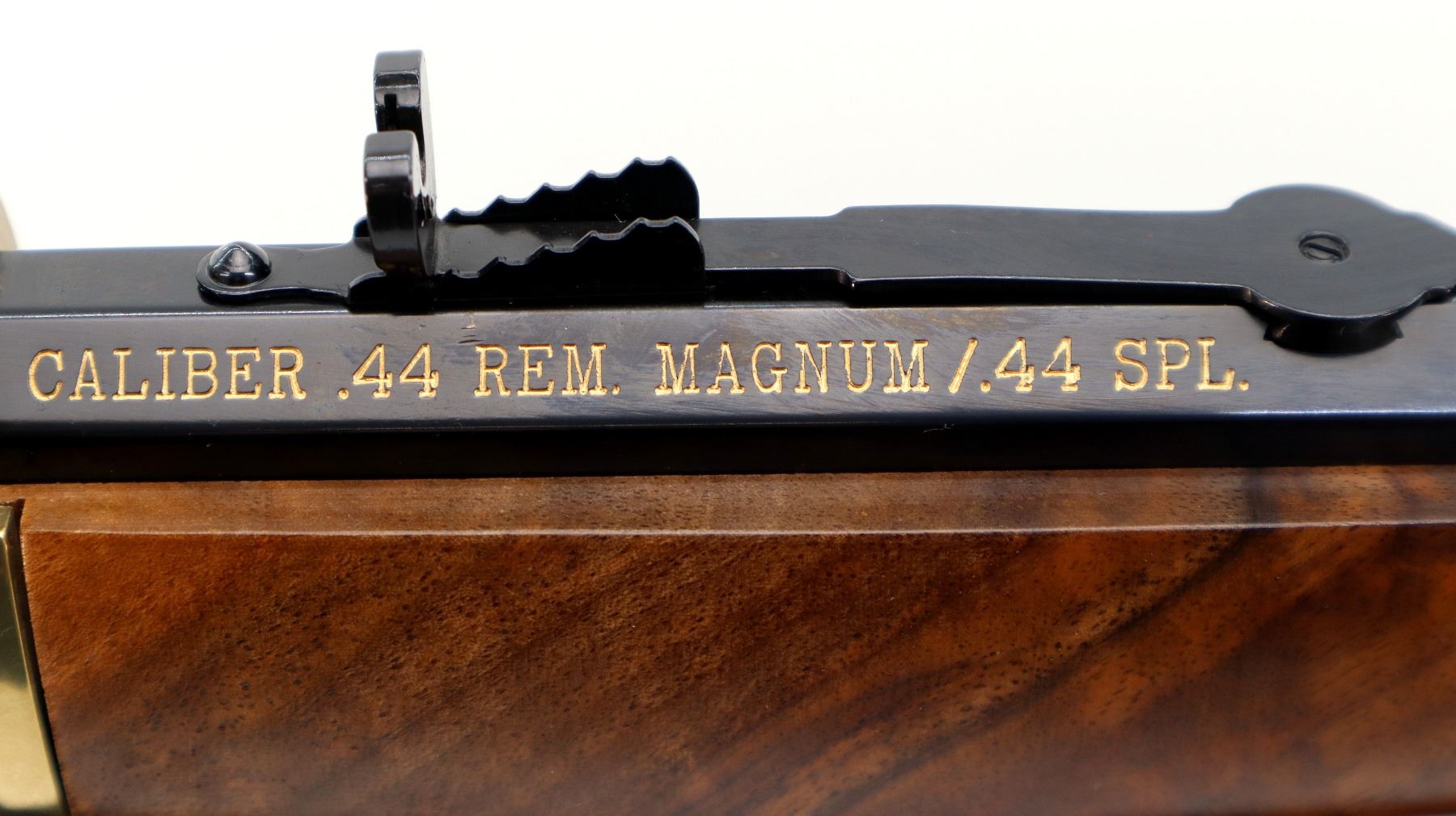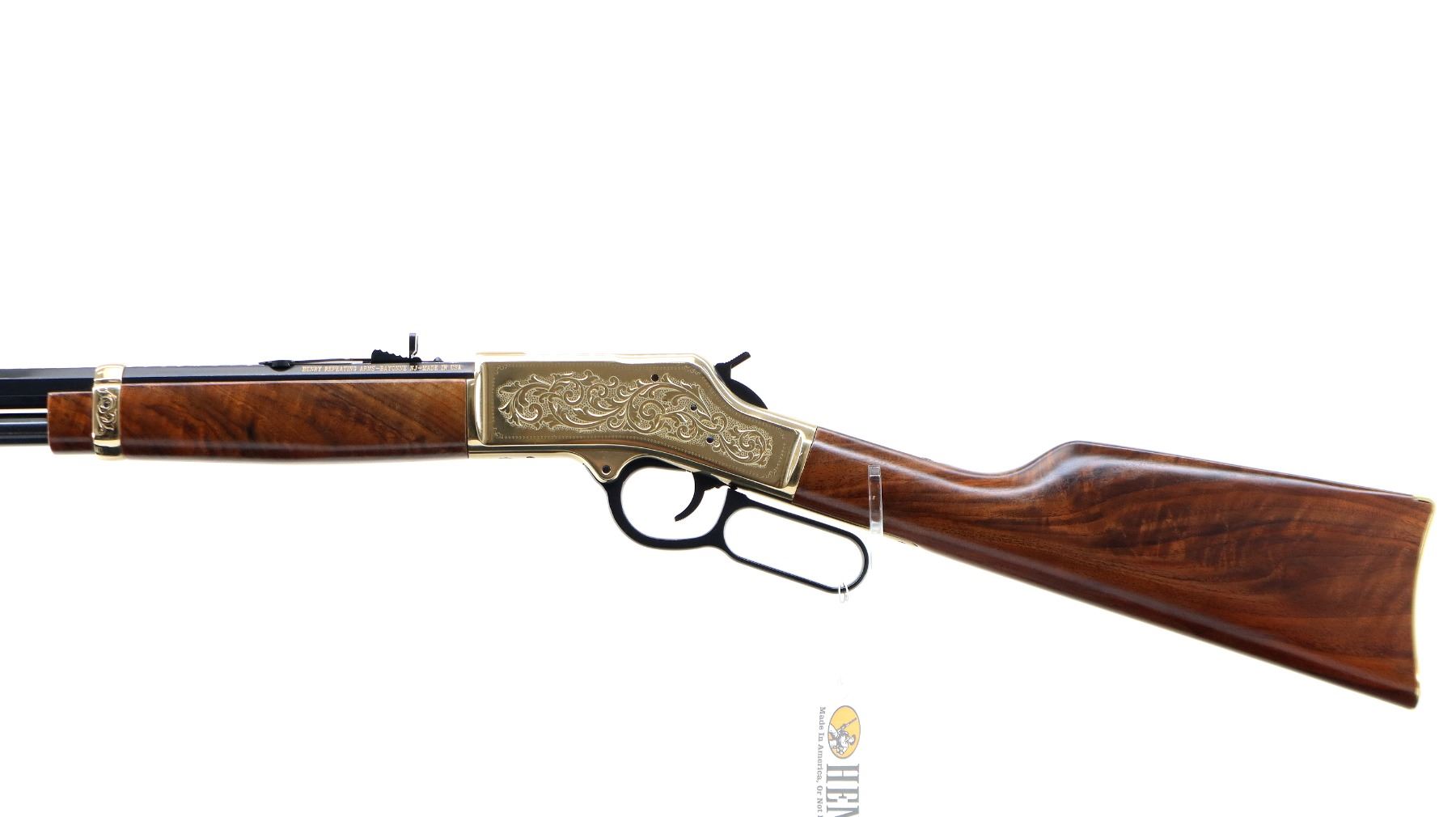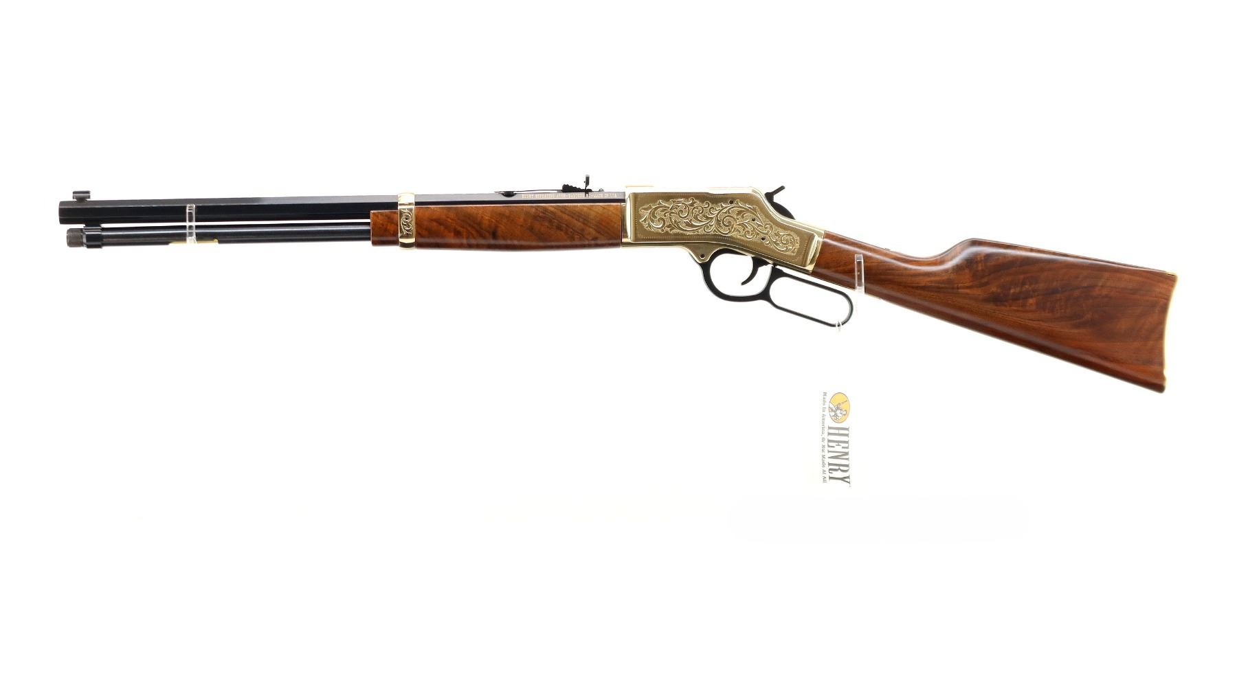 Main Description: Blade front sight, adjustable u notched semi buckhorn rear sight, polished blued octagon barrel, lever and full length magtube. Engraved gold receiver and barrel band, top is drilled and tapped with plug screws installed, grooved spur hammer, side loading gate. Two piece Satin finish wood stocks, smooth curved steel butt plate, retains factory hang tags.