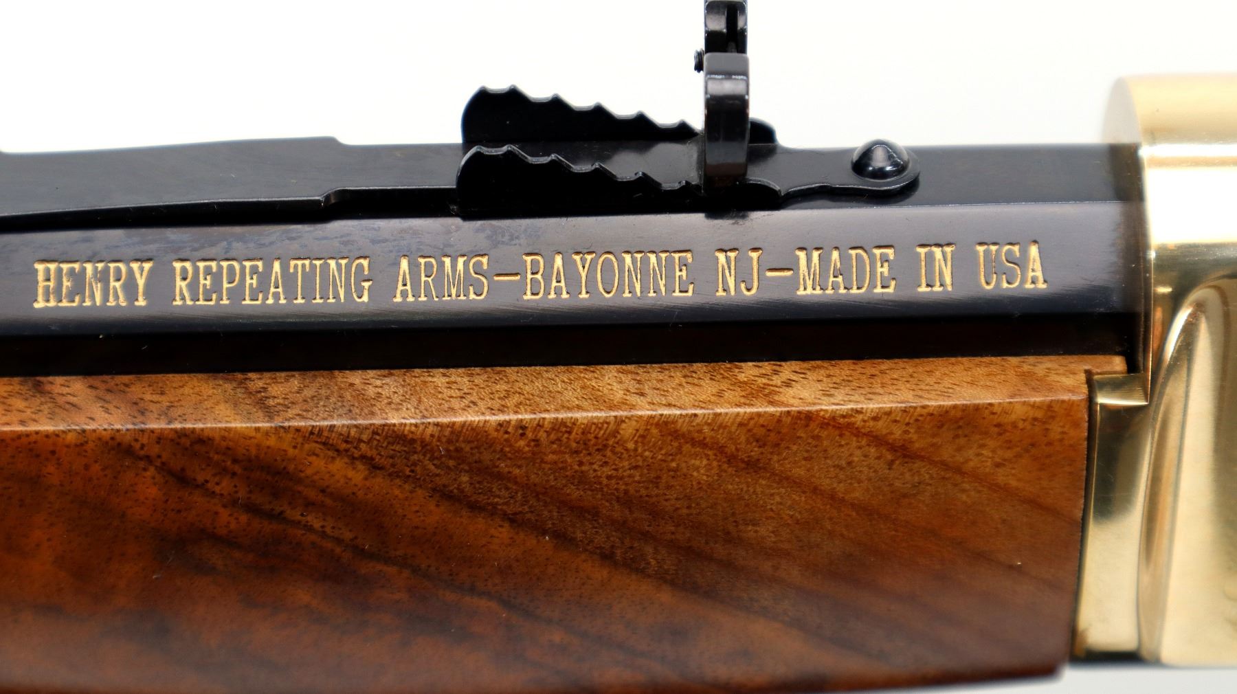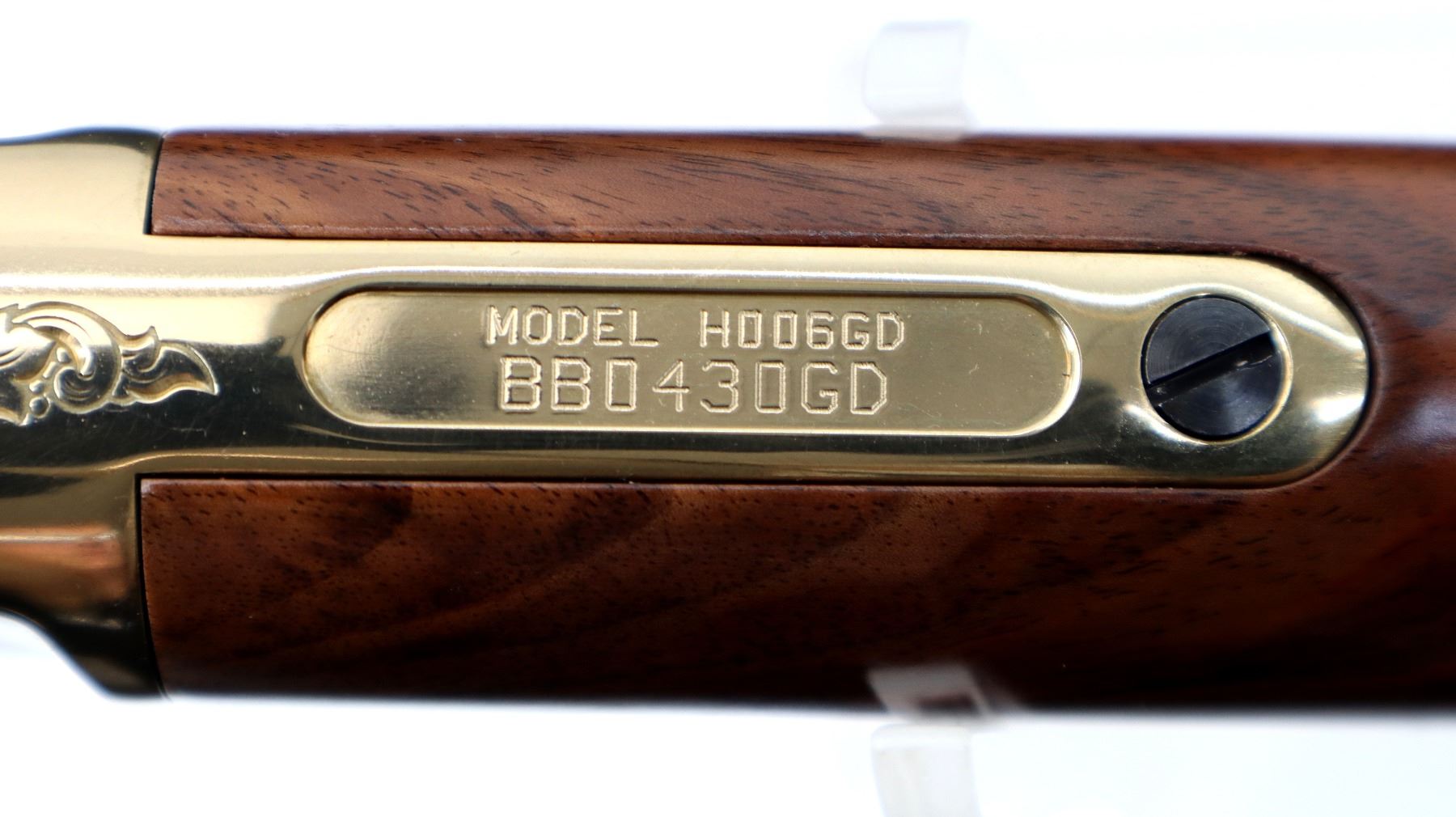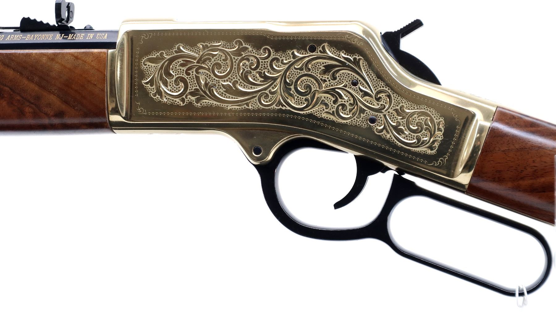 Main Description: Blade front sight, adjustable u notched semi buckhorn rear sight, polished blued octagon barrel, lever and full length magtube. Engraved gold receiver and barrel band, top is drilled and tapped with plug screws installed, grooved spur hammer, side loading gate. Two piece Satin finish wood stocks, smooth curved steel butt plate, retains factory hang tags.