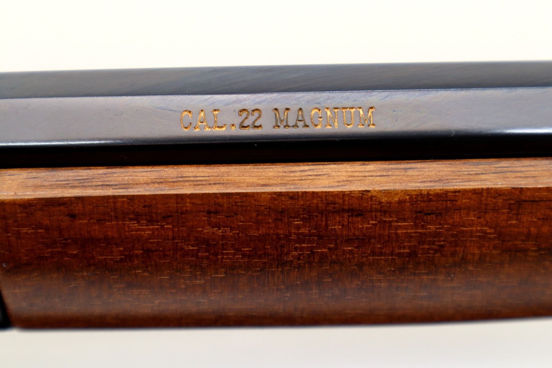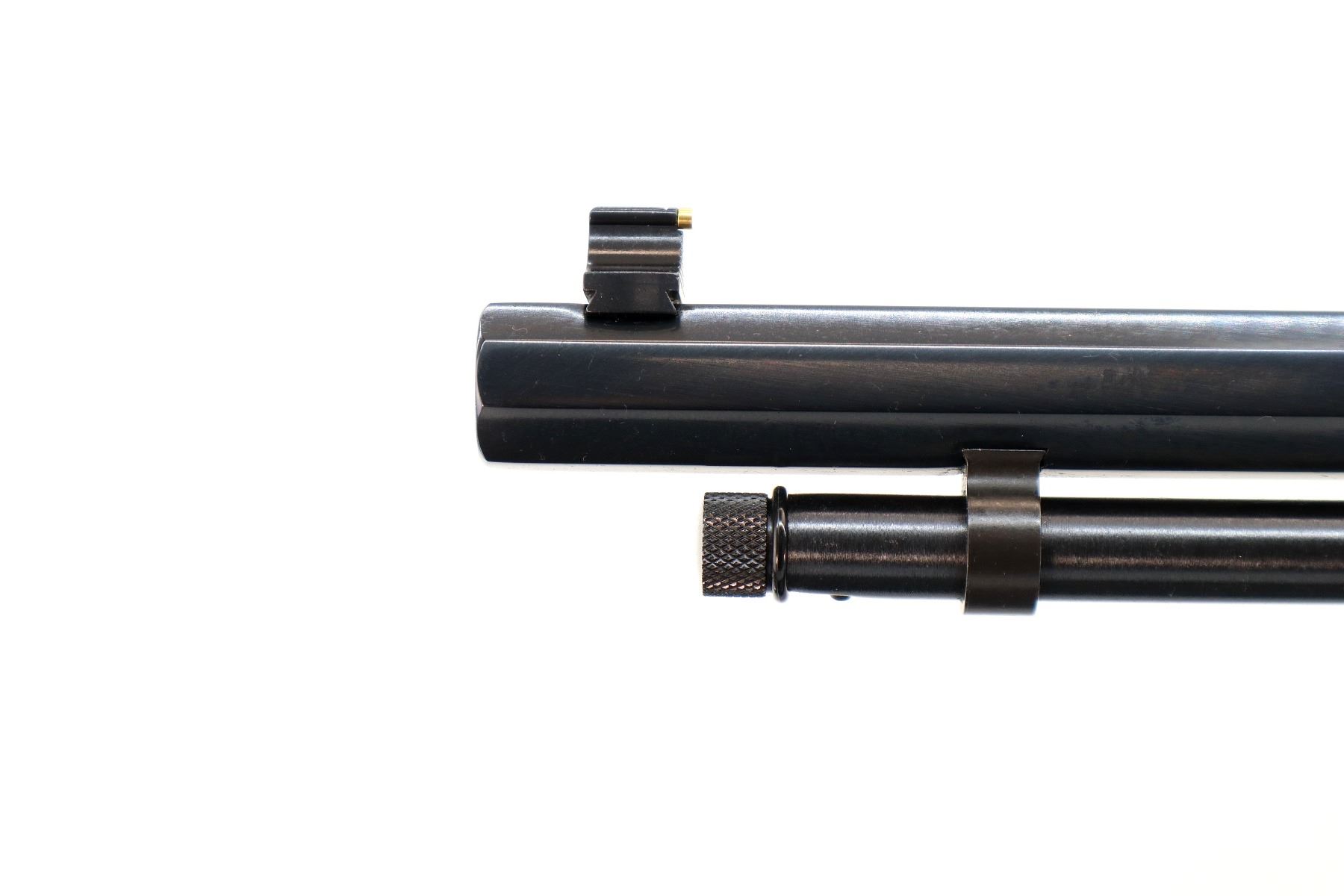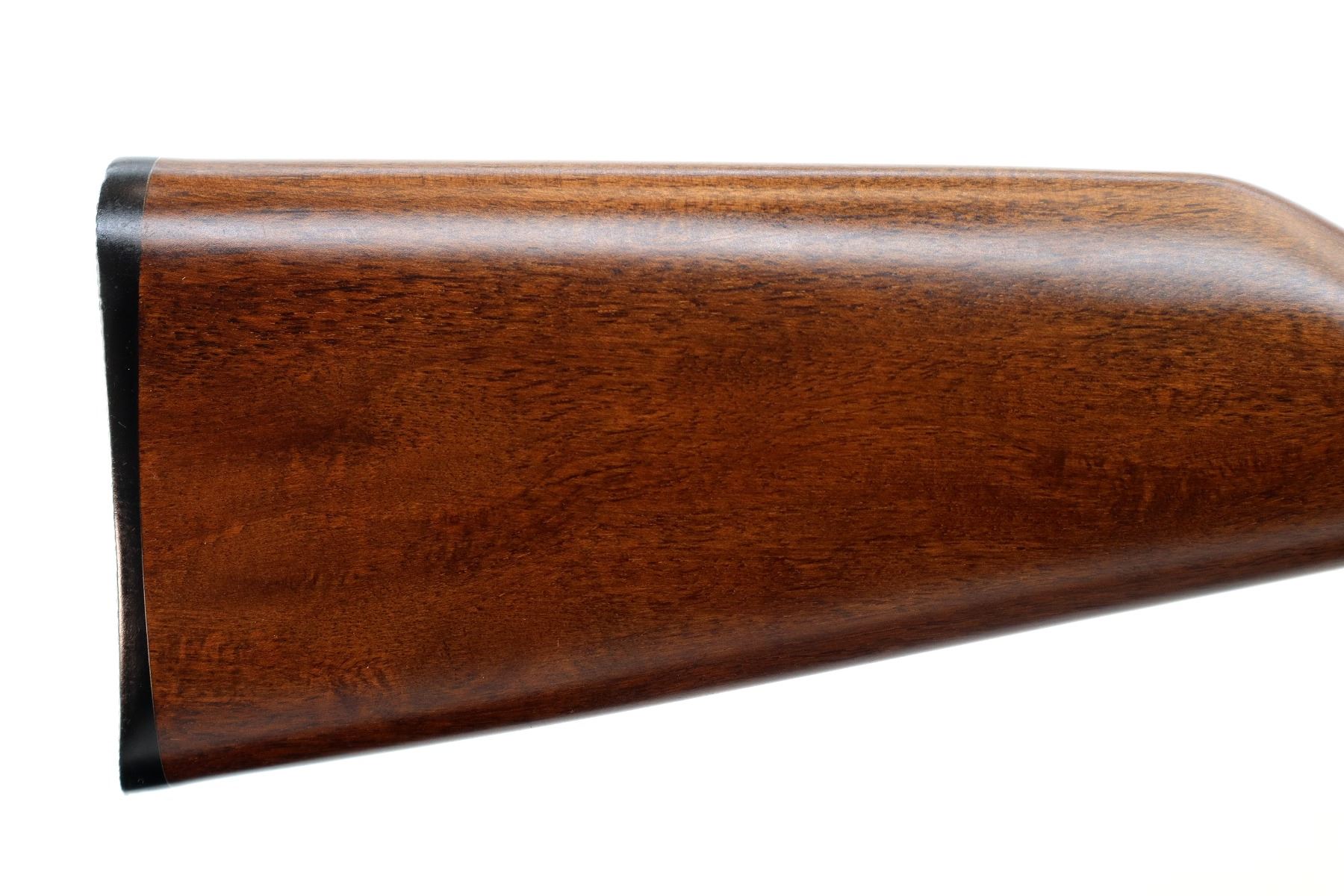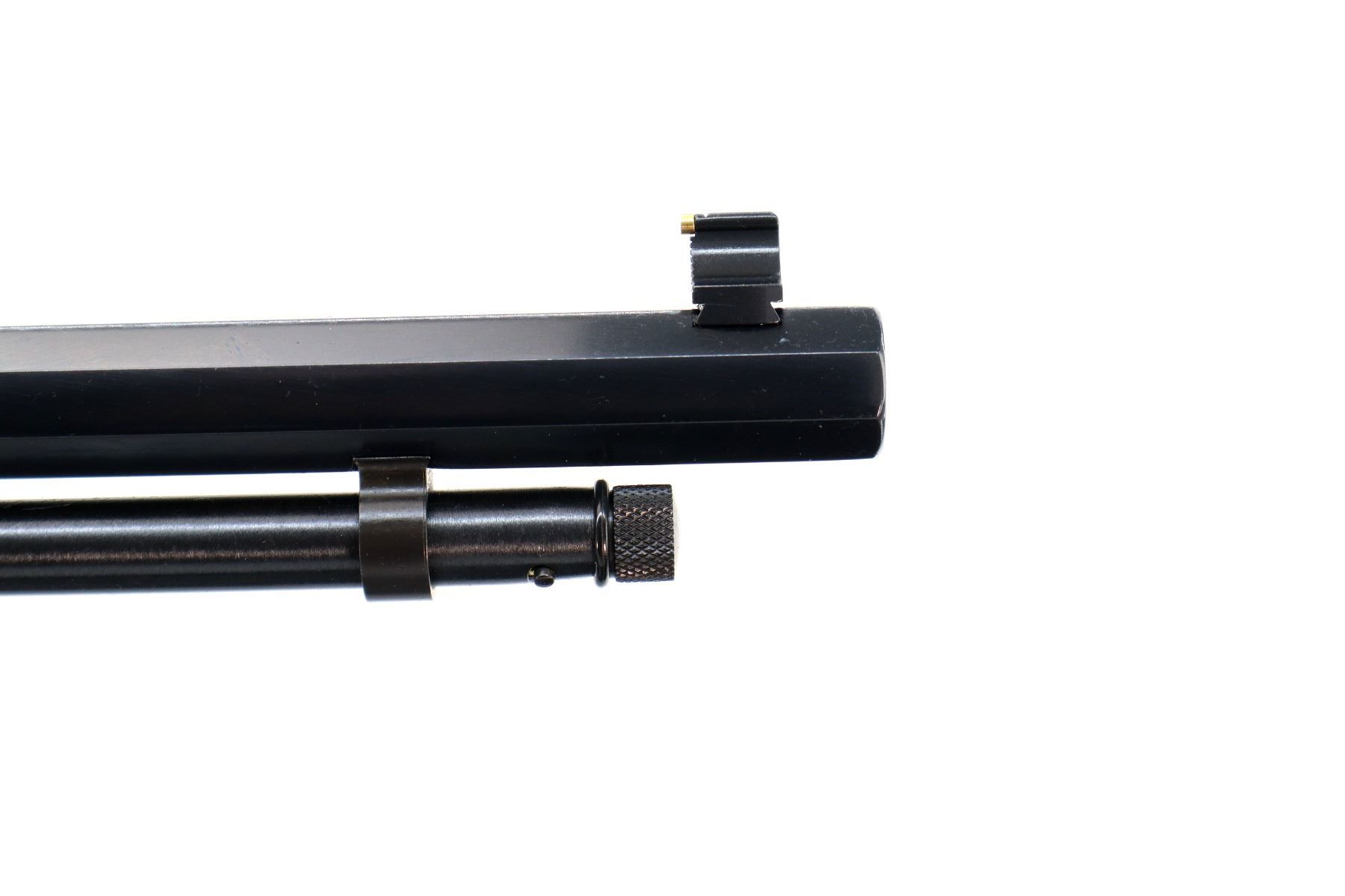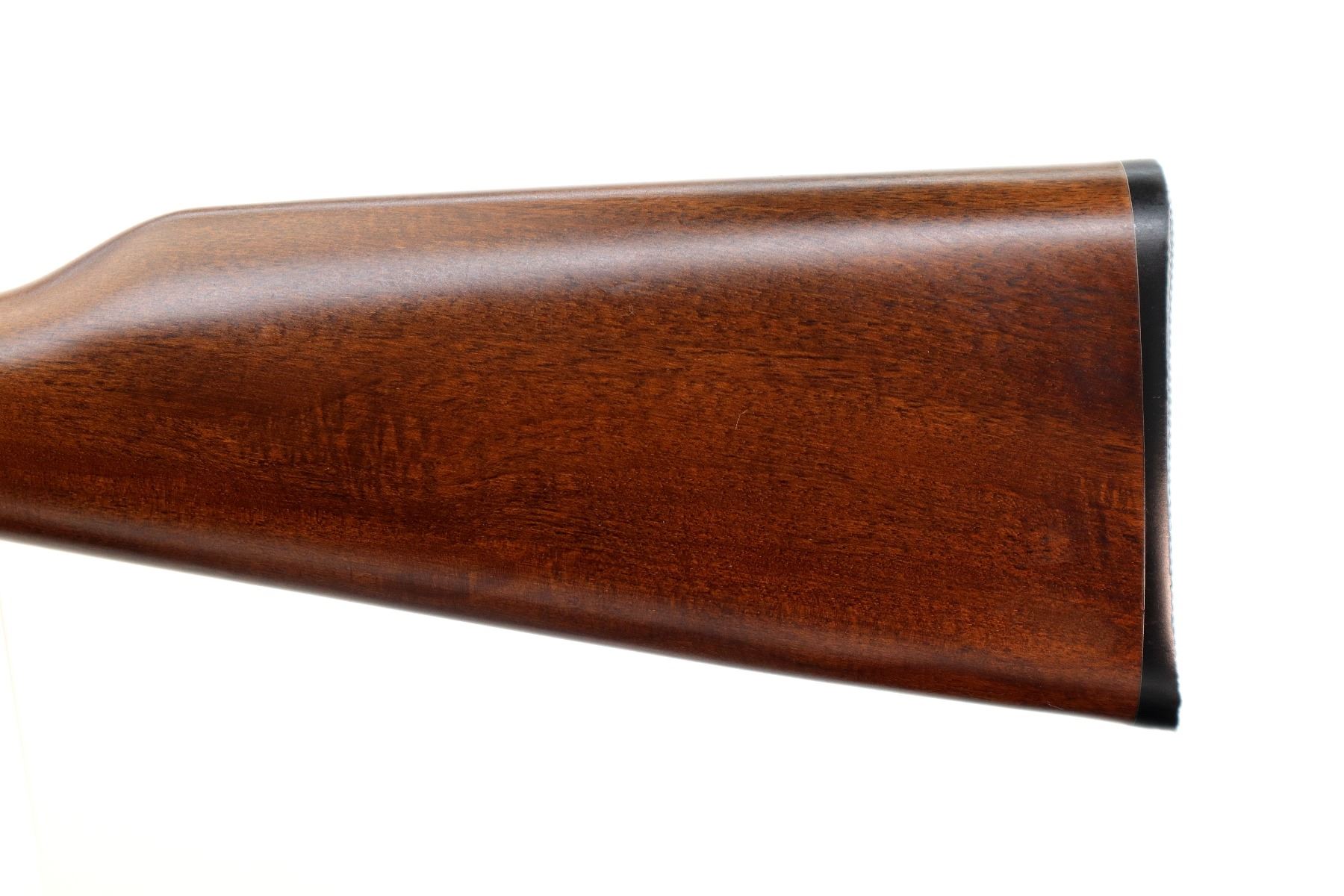Main Description: Blade front sight, adjustable Skinner rear peep sight, blued octagon barrel and outer magtube, grooved black alloy receiver, spur hammer, large loop lever. Two piece wood stocks, straight grip, checkered black polymer butt plate