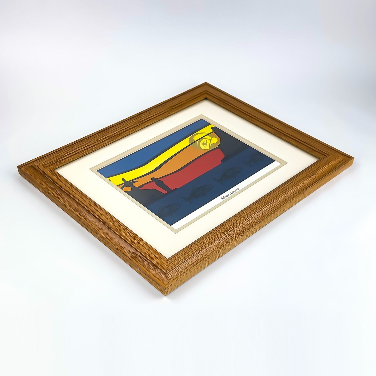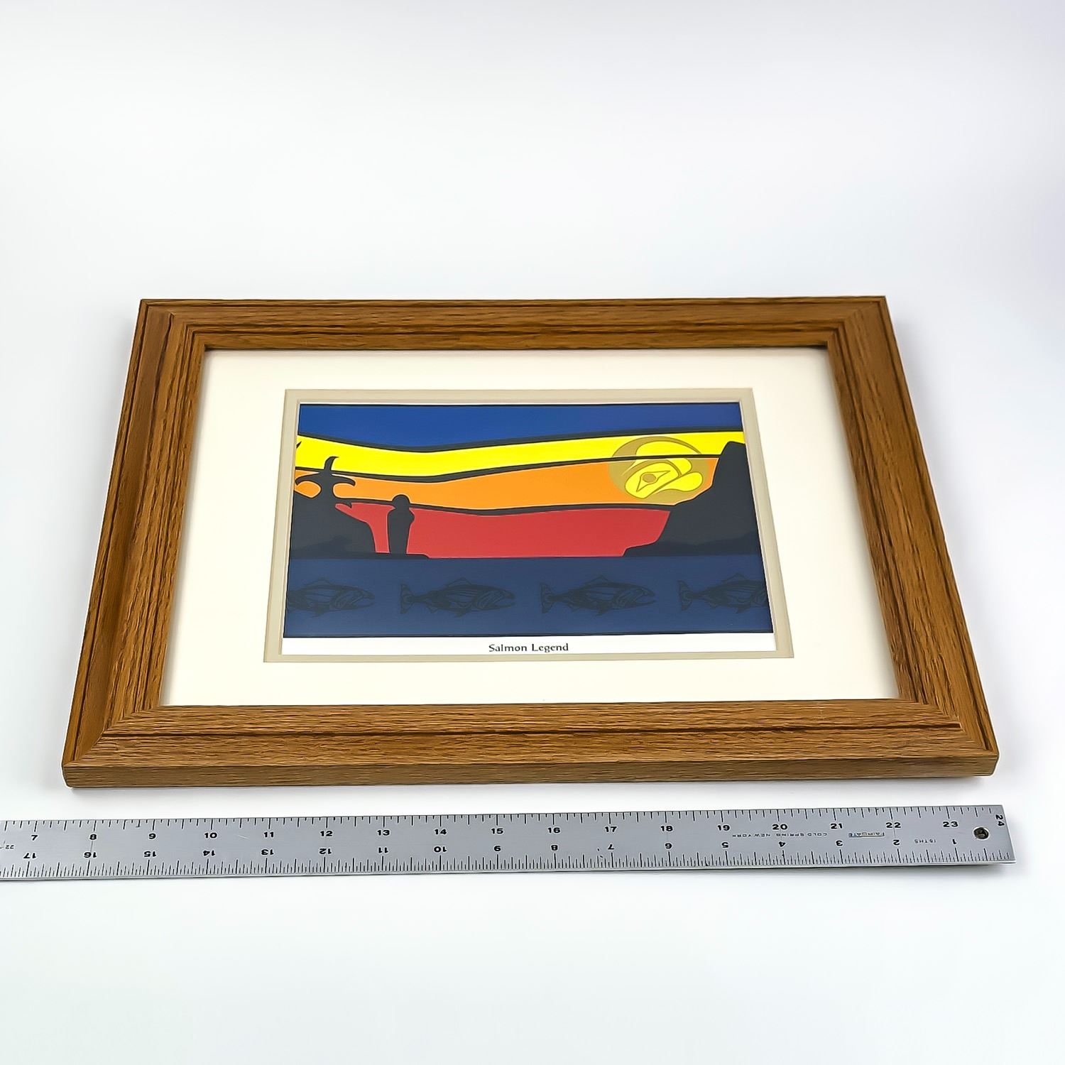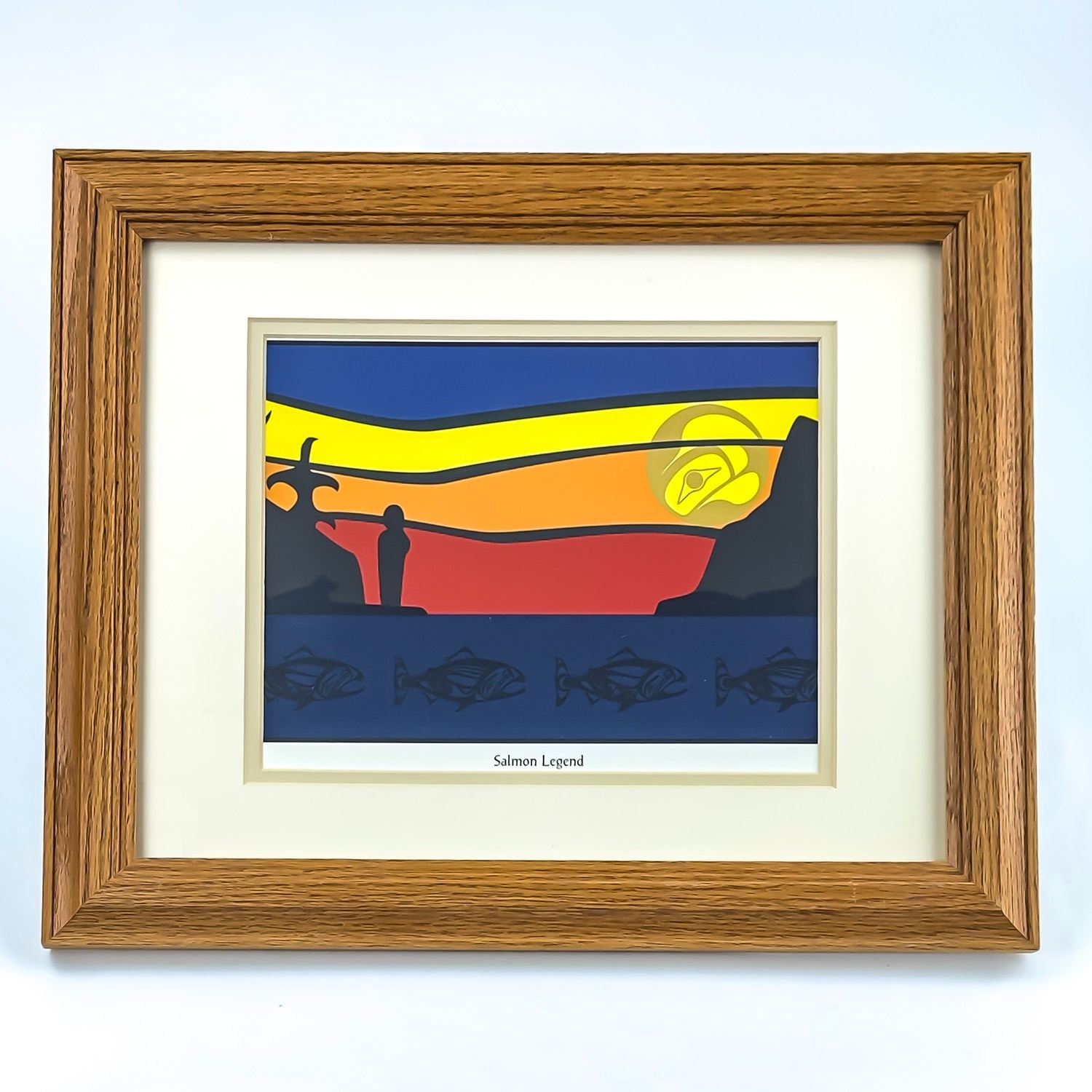 #9047 - HENRY ROY VICKERS FRAMED CALENDAR ART PRINT TITLED: SALMON LEGEND. HENRY ROY VICKERS IS A WORLD-RENOWNED CANADIAN FIRST NATIONS ARTIST, PRINTMAKER, CARVER, PAINTER, DESIGNER, AUTHOR AND MORE. WOOD FRAME AND UNDER GLASS HOME OR OFFICE WALL DECOR PICTURE. MEASURES 16.5 (42 CM) WIDE BY 13.5” (34 CM) HIGH - INCLUDES FRAME.