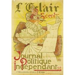 L’Eclair, Journal politique independant. Eine Frau in schickem Kleid und Hut liest in L’Eclair. Werbeplakat. Farblithographie bei Chaix, Paris 1897. - Mit dem Namenszug, Datum, Verlegeradresse und Text sowie mit dem Zensurstempel “Republique Française” in der Darstellung. Auf Vélin. Größe: 124 x 88 cm. Mit kleinen Randläsuren, Einrissen an den Knickfalten (teils gebrochen) und auf Leinen aufgezogen.