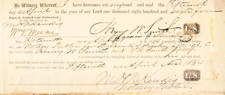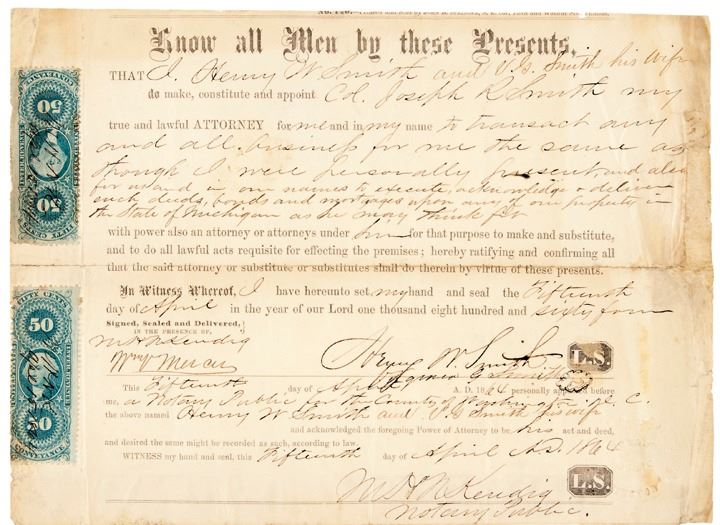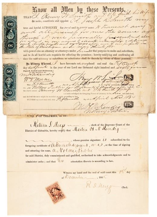 April 15th, 1864-Dated Civil War Era, Partially-Printed Document Signed, “Henry W. Smith,” at Washington (D.C.), Granting Power of Attorney, Signed Exactly One Year to the Day President Abraham Lincoln was Assassinated by John Wilkes Booth, Officially Attested and Notarized on April 18, 1865, Fine to Very Fine.This original Document was quite remarkably Signed, “Henry W. Smith” dated on April 15th, 1864, at Washington (D.C.), being the very day that President Abraham Lincoln died. Major Smith and his wife are granting Power of Attorney to Colonel Joseph R. Smith, regarding certain of their property holdings in the State of Michigan.