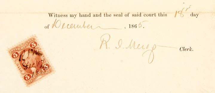 There is some expected tone, edge wear and creasing from actual use. The two official blue 50¢ US Internal Revenue Postage Stamps are intact and attached. There are some deft archivally sealed splits along the main horizontal folds. This Document measures approximately 8.5" wide x 6.5" tall (about 8.75" x 12.25" including verification form).