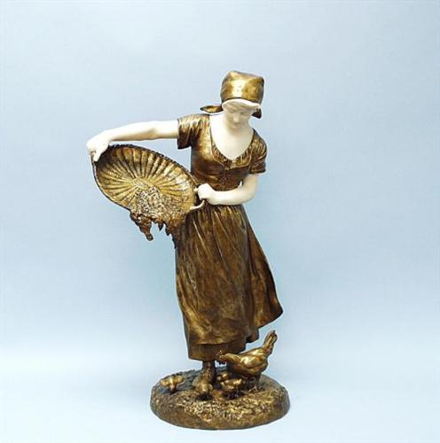 HENRYK KOSSOWSKI JR. (1855-1921) Polish school. "Young Girl Feeding Chickens". A French bronze and Carrara marble figure. Signed and with French bronze stamp on a naturalistic base. 29" high. Ref. Benezit, vol. 5, p.301.