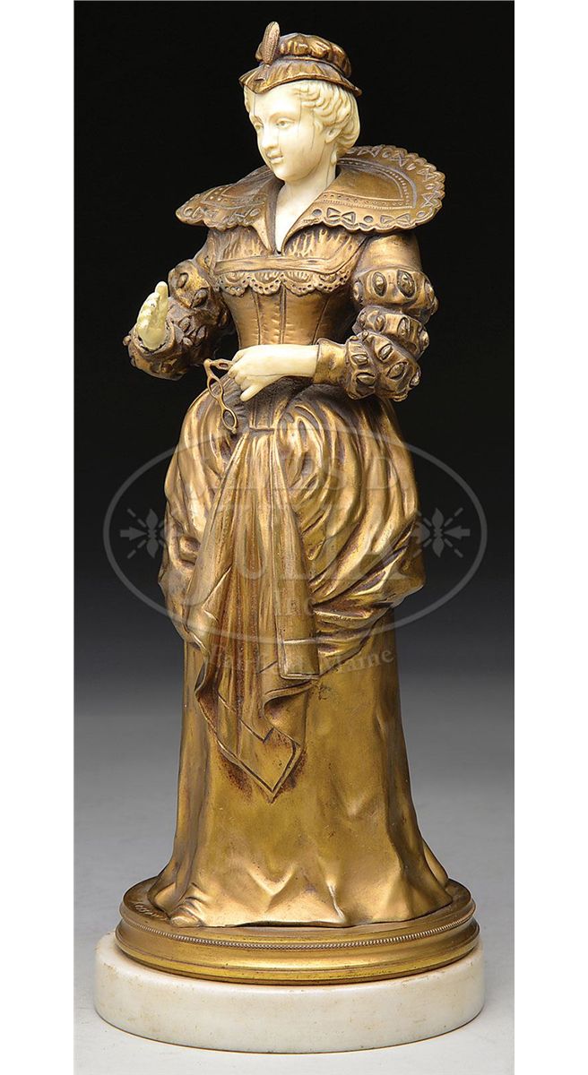 Bronze and ivory Signed on base "Kossowski" Mounted on round white marble base SIZE: Bronze: 11-1/2" h. With base: 12-1/2" h. CONDITION: Right hand is wood replacement, ivory head and hands with age lines, some rubs to dore finish. 9-29468
