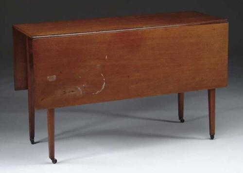 HEPPLEWHITE DROP LEAF INLAID TABLE. Table has rectangular leaves, square tapered legs with light colored line inlay. Edge banding crosses leg. Fine grain wood, possibly mahogany, with a light finish. Legs have caster feet on shortened legs. SIZE: 30” h x 48” x 47-1/2” (open); 16” (closed). CONDITION: Top has white ring stains, otherwise good . 9-27479