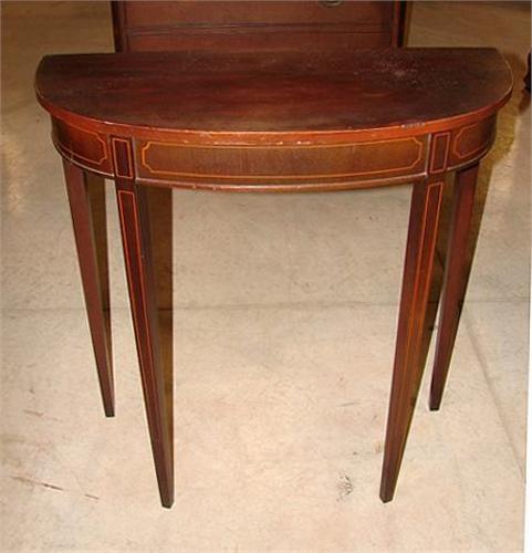 HEPPLEWHITE STYLE MAHOGANY DEMILUNE TABLE WITH INLAY. Shows surface scratching at top. 30” H, 27.75” L, 12” D
