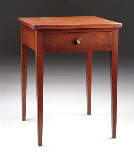HEPPLEWHITE ONE DRAWER STAND. Made of cherry wood. The drawer having an antique rosette type knob. SIZE: 25-1/2in. h x 19-1/4in. x 18-1/2in. top. CONDITION: Very good. 9-26077